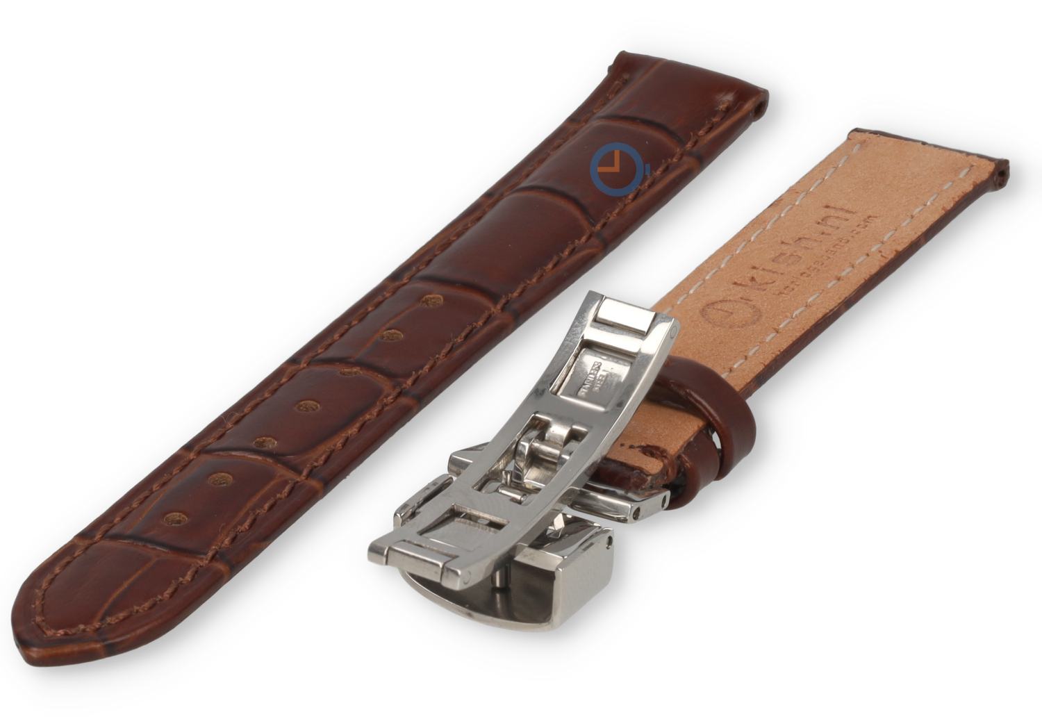 15mm horlogeband van croco leer met luxe vlindersluiting donkerbruin. Dit horlogebandje heeft een oneven maat: 15mm. Deze leren horlogeband is gemaakt van hoogwaardig rundleer met een klassieke krokodillenstructuur die zorgt voor een rijke, stijlvolle uitstraling. Het fijn afgewerkte stiksel loopt subtiel mee in de kleur van het leer en geeft de band een tijdloze uitstraling. De vlindersluiting maakt het geheel compleet: comfortabel, stevig en elegant.