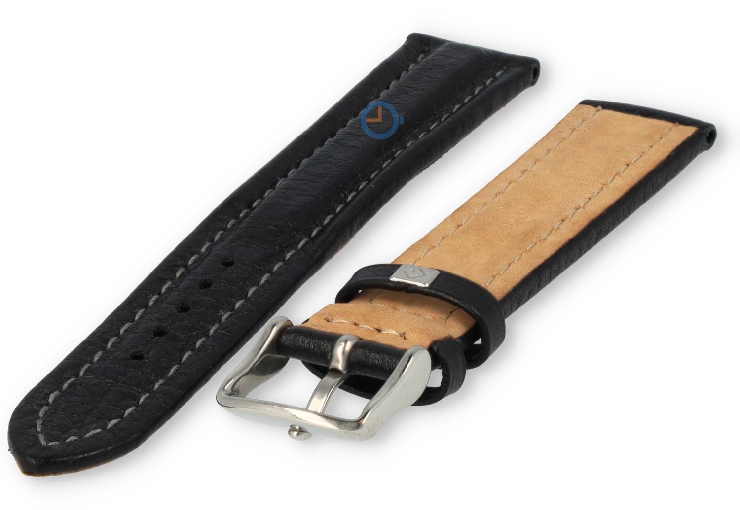 18mm opgevulde horlogeband van zwart leer. Stevige horlogeband met opvulling. Zwart leer met witte stiksels en een stevige, stalen gesp..