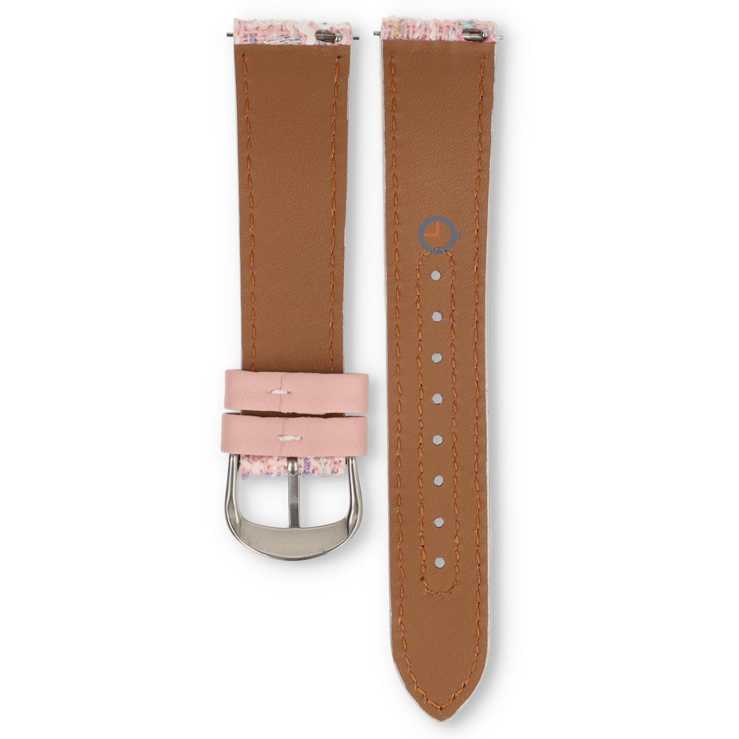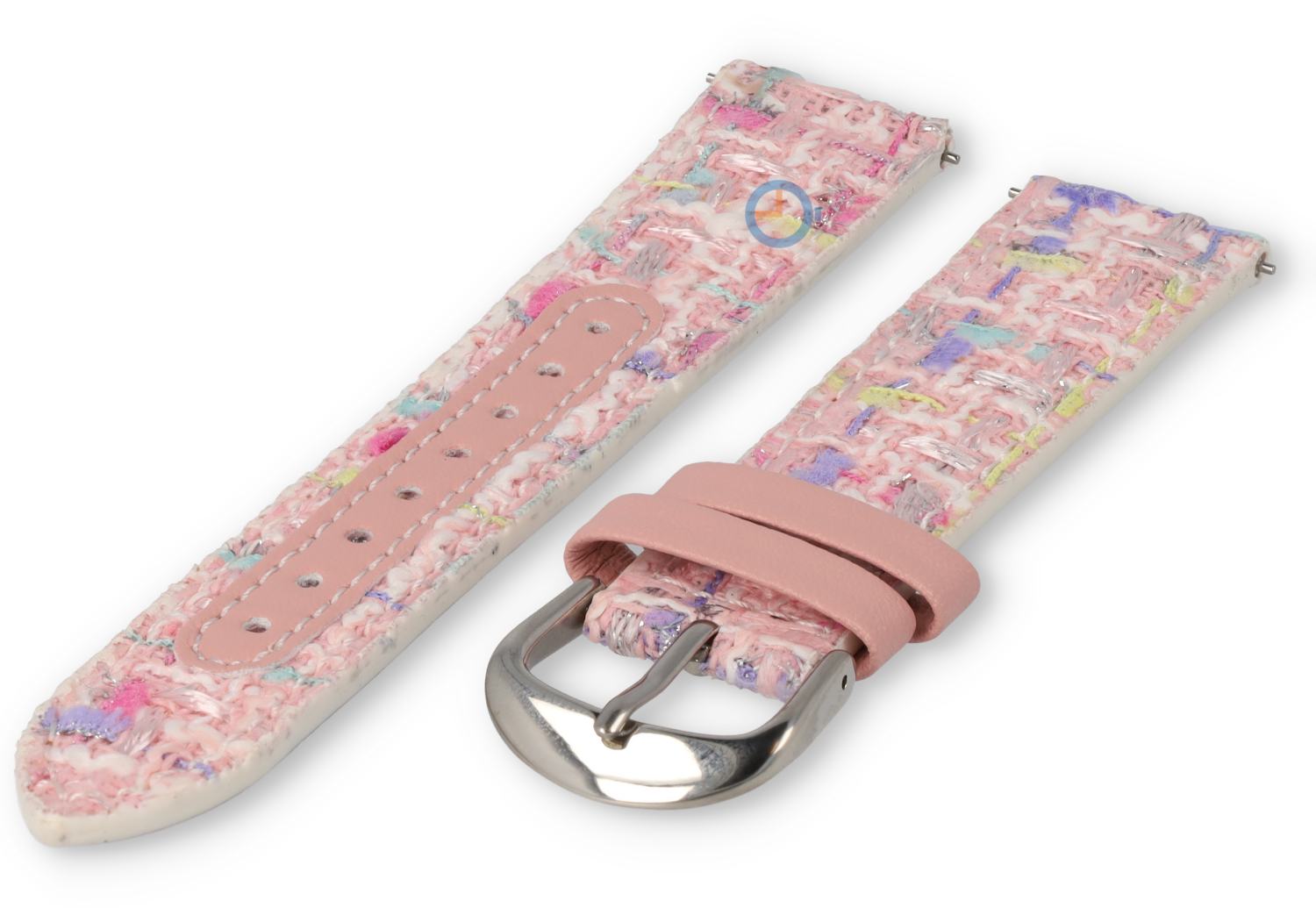 Een fraaie 20mm horlogeband gemaakt van leer en stof met heel veel kleuren. Dit kleurrijke bandje heeft een basis van pu-leer en een toplaag van gewoven stof. In de horlogeband is een Quick-Switch pin verwerkt, zodat jij het bandje snel kan wisselen.