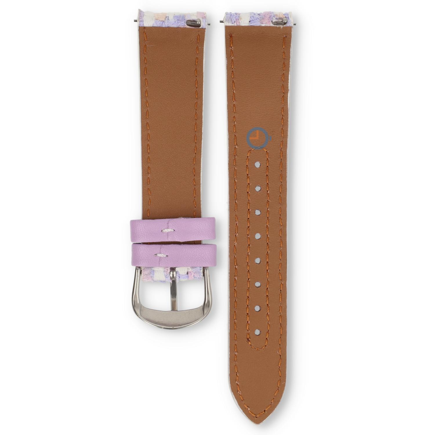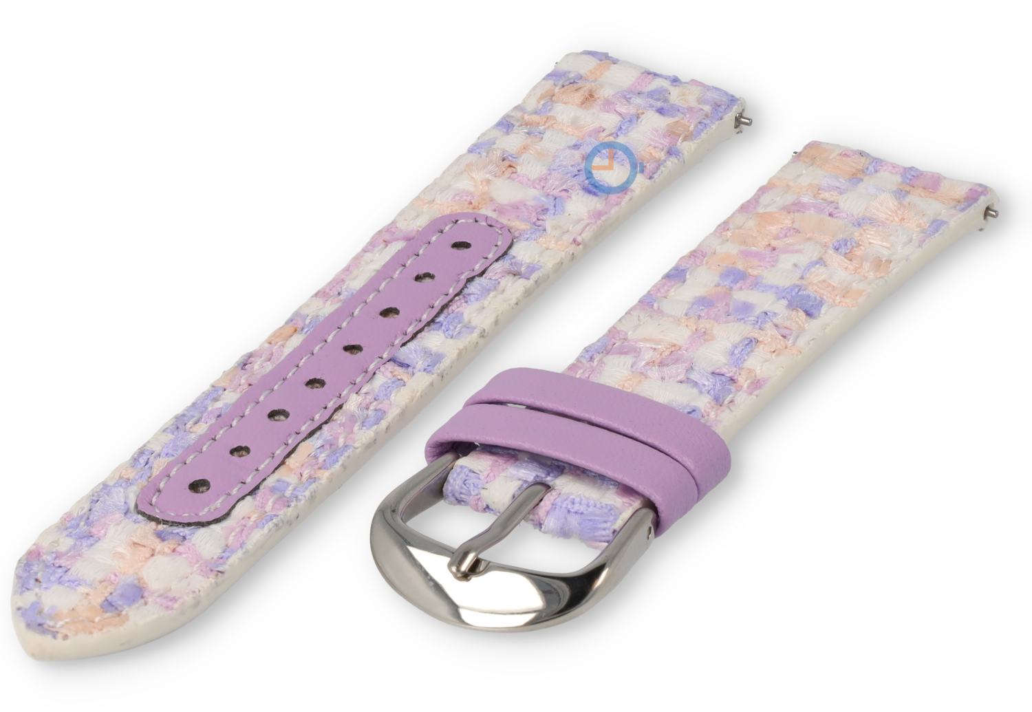 Een fraaie 20mm horlogeband gemaakt van leer en stof met heel veel kleuren. Dit kleurrijke bandje heeft een basis van pu-leer en een toplaag van gewoven stof. In de horlogeband is een Quick-Switch pin verwerkt, zodat jij het bandje snel kan wisselen.