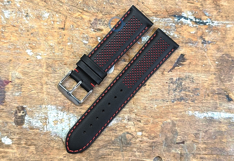 Op zoek naar eens een horlogebandje anders dan anders? Bestel dit 22mm hybrid bandje - zwart met rood . Deze horlogeband is gemaakt van echt kalfsleer en is geperforeerd. De gaatjes zijn gelaserd voordat de banden in elkaar gezet zijn.