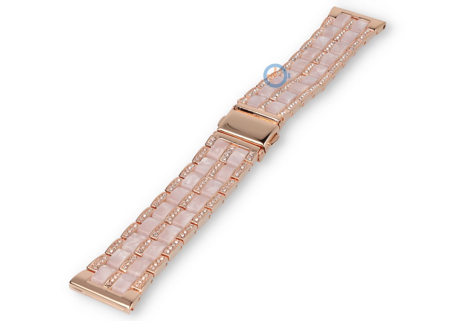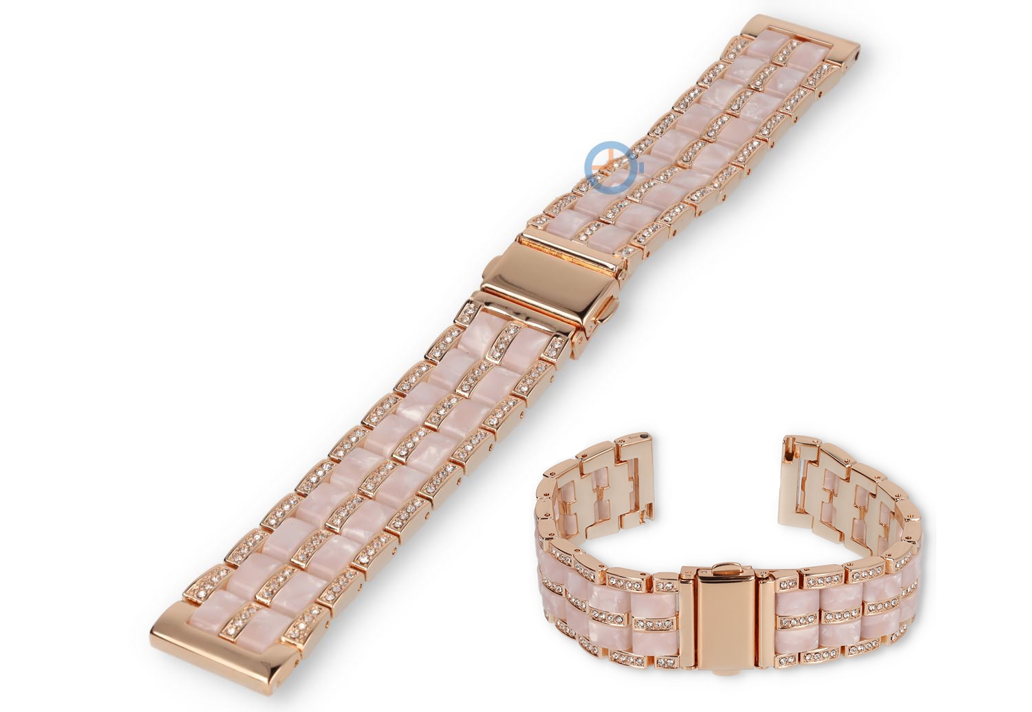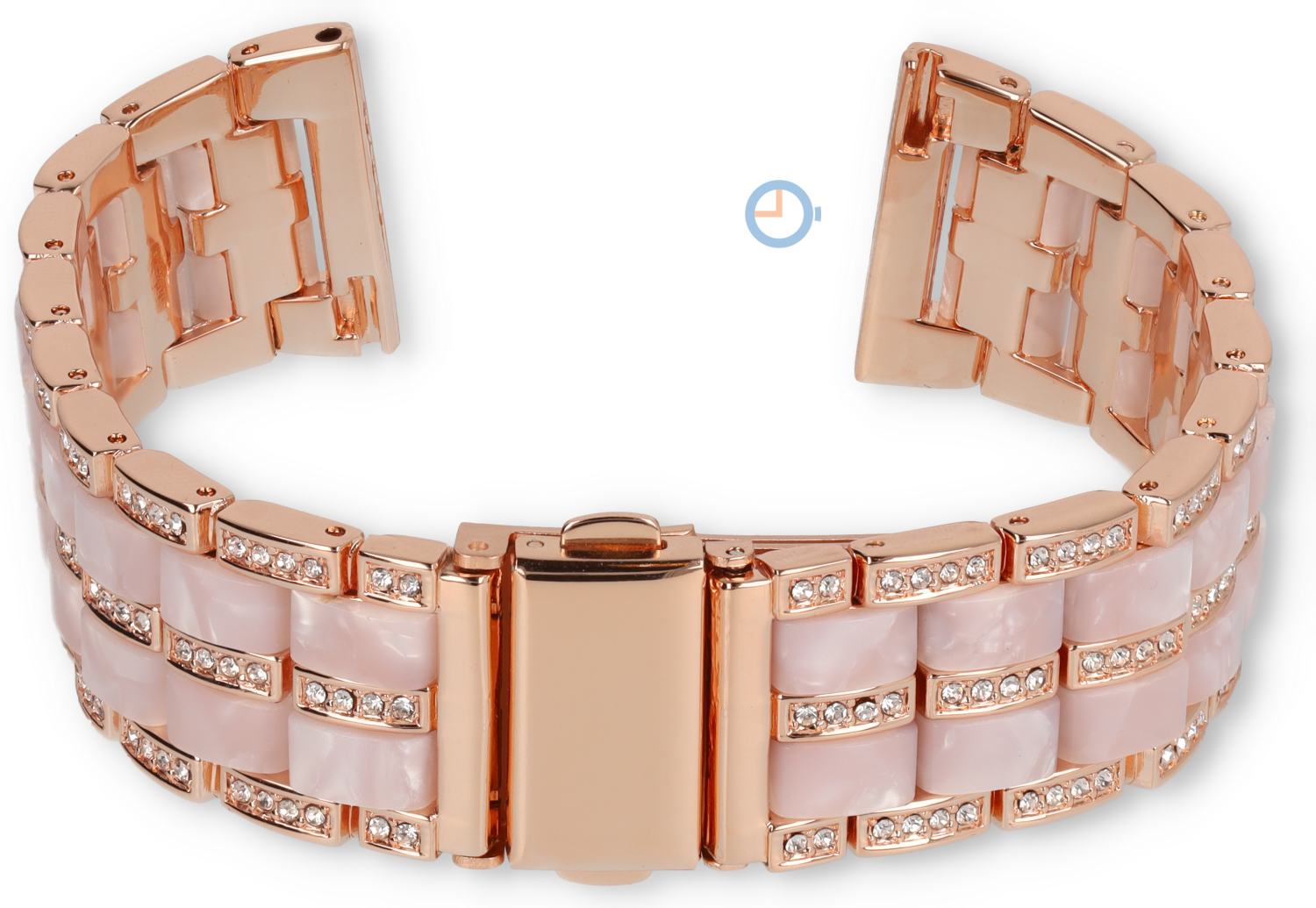 D007 - elegante en verfijnde horlogeband met luxe details - roestvrij staal met marmer-resin en steentjes - 22mm - ros?oud met roze - lengte: 175mm - De bandbreedte bij de aanzet is 22mm en je kunt het bandje bevestigen met quick-switch pinnen. De lengte is maximaal 175mm (exclusief horlogekast) en kun je inkorten met 6 schakels. De vouwsluiting is veilig en open je met 2 drukkers.