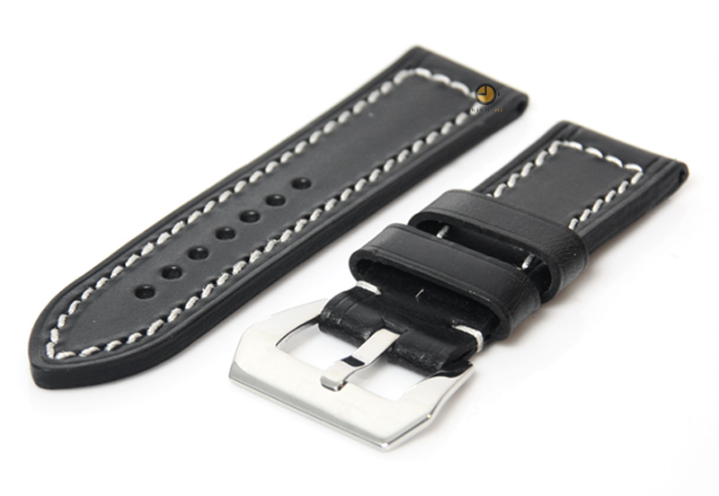 24mm horlogeband gemaakt van zwart leer met studs. Een sterke horlogeband met Panerai-look gespsluiting. Deze sluiting geeft je de mogelijkheid om het bandje precies op maat te dragen. Het dikke leer is met de hand gestikt en een mooie finishing touch. Het horlogebandje wordt geleverd inclusief sluiting en je plaatst het bandje eenvoudig zelf met 24mm pushpins en een tool om de horlogeband te verwijderen.