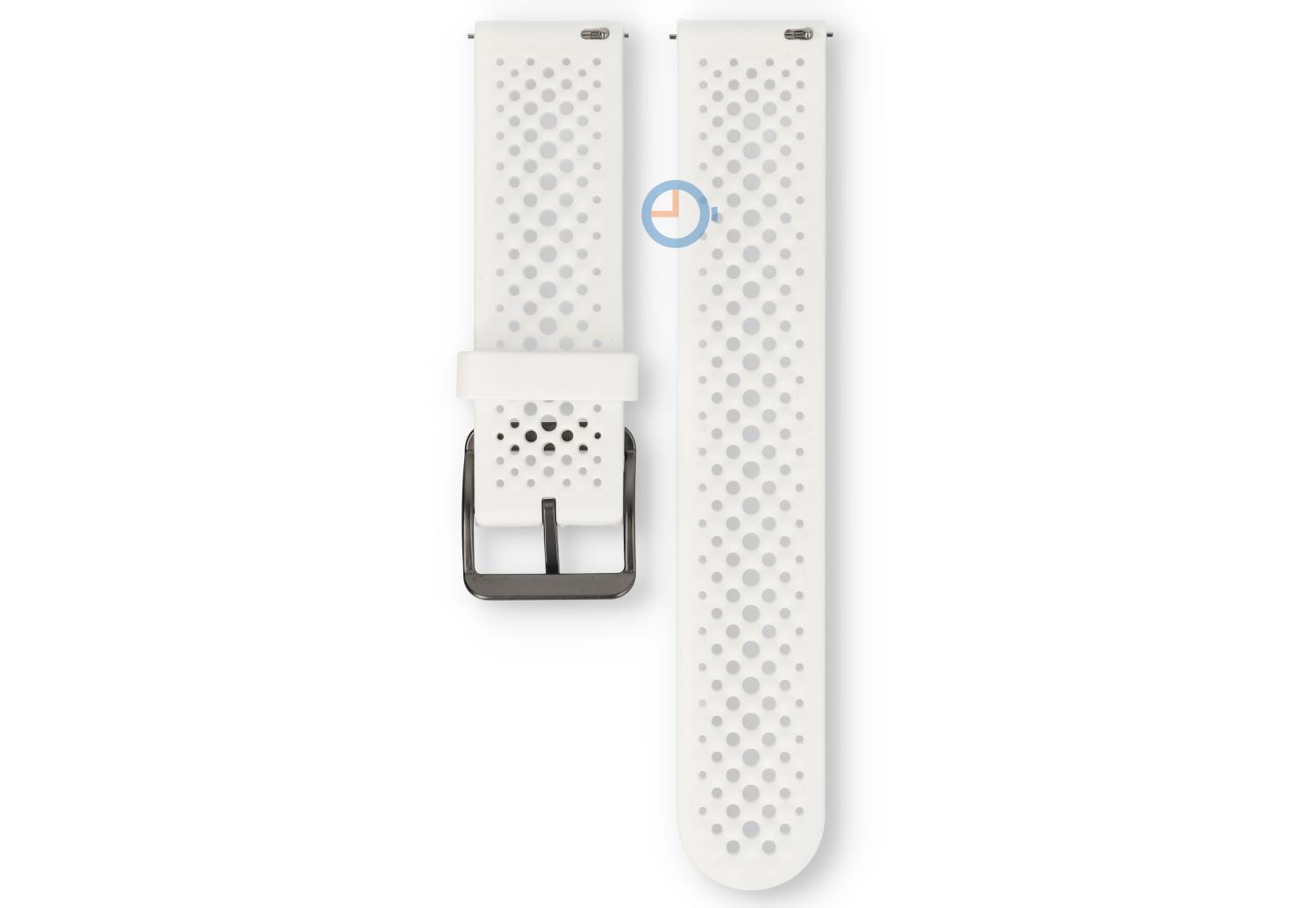 22mm wit siliconen horlogebandje - ademend en sportief | Dit universele siliconen bandje is ideaal voor iedereen die op zoek is naar comfort en een sportieve uitstraling. Het geperforeerde ontwerp zorgt voor optimale ventilatie, waardoor je pols koel blijft, zelfs tijdens de meest intensieve activiteiten. Het bandje is geschikt voor diverse horloges met een (rechte) bandbreedte van 22mm.