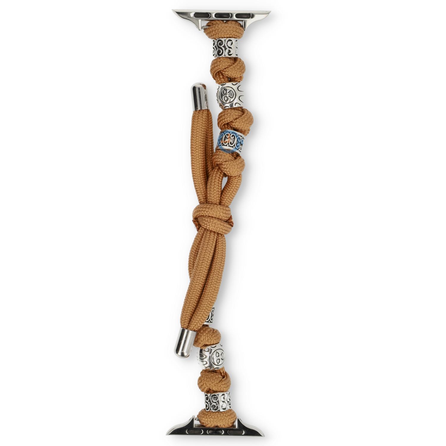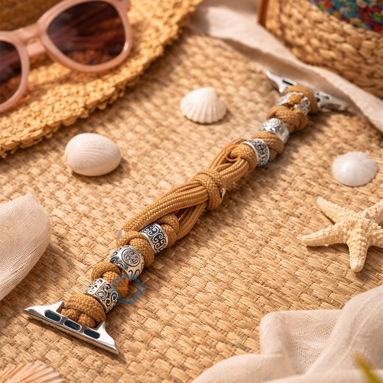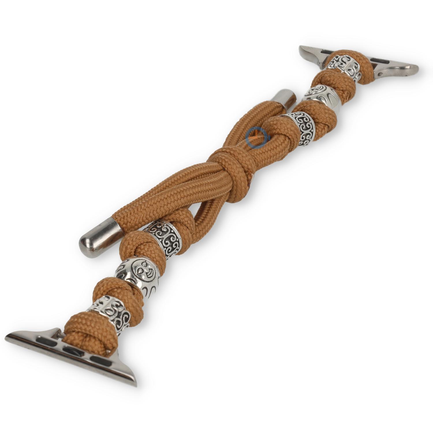 Dit is een speciaal ontworpen horlogeband voor Apple Watch 41mm, gemaakt van stevig veterkoord met geknoopte details. De stalen bedels zijn voorzien van fijne gravures, wat de band een artistieke, bohemian uitstraling geeft. Elke bedel zit stevig tussen de knopen, waardoor de band niet alleen mooi oogt maar ook goed blijft zitten.