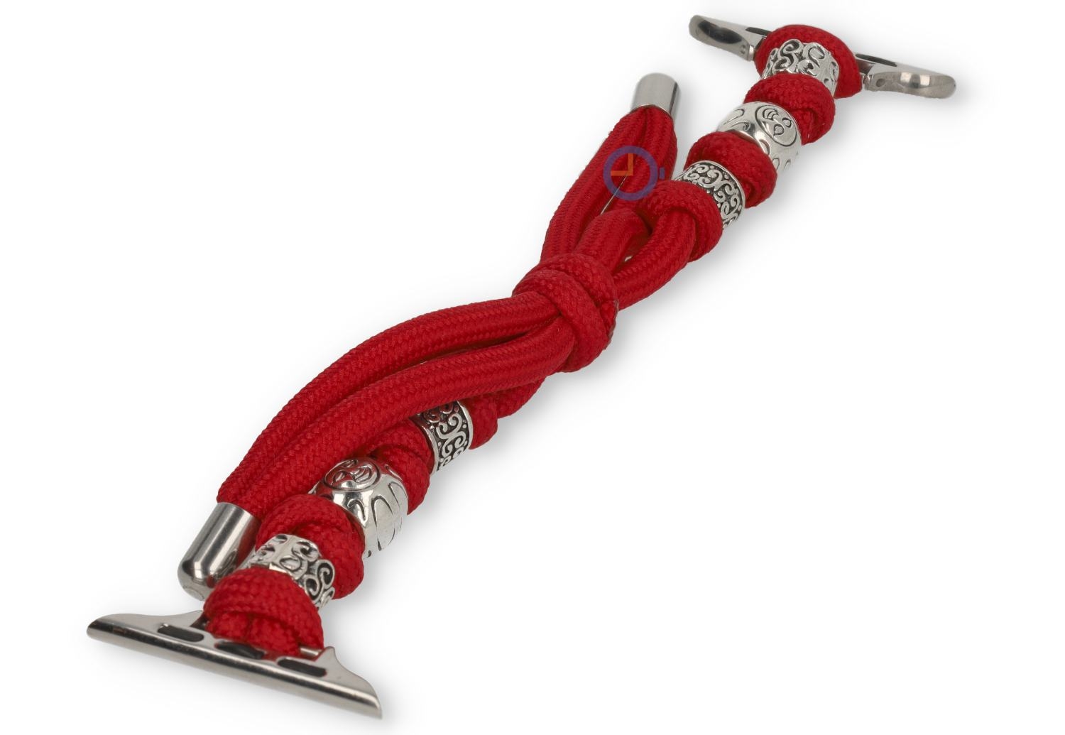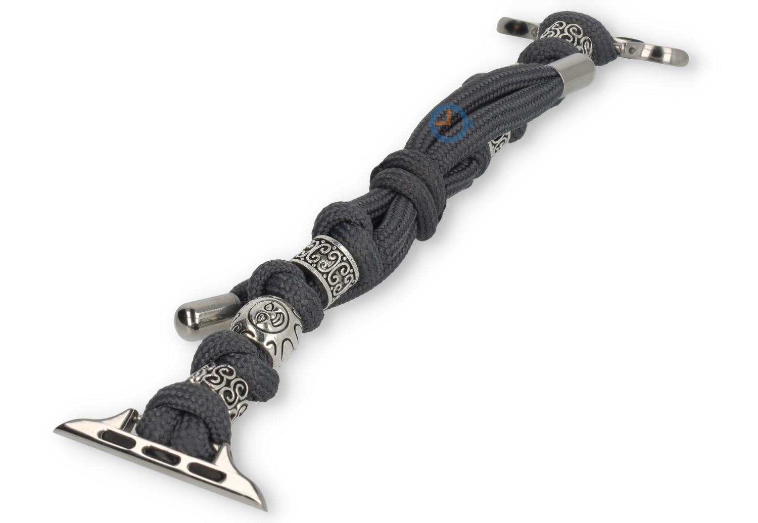 Dit is een speciaal ontworpen horlogeband voor Apple Watch 41mm, gemaakt van stevig veterkoord met geknoopte details. De stalen bedels zijn voorzien van fijne gravures, wat de band een artistieke, bohemian uitstraling geeft. Elke bedel zit stevig tussen de knopen, waardoor de band niet alleen mooi oogt maar ook goed blijft zitten.