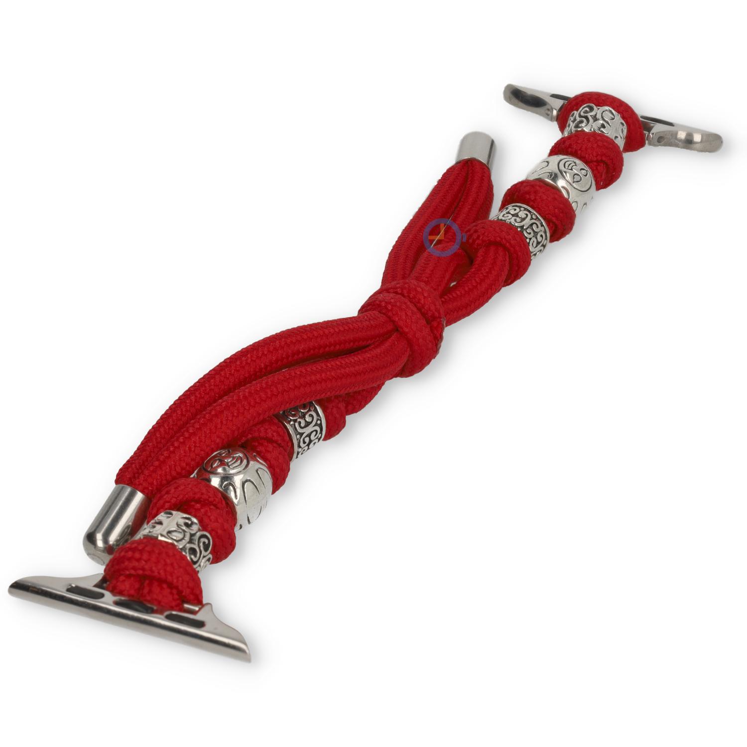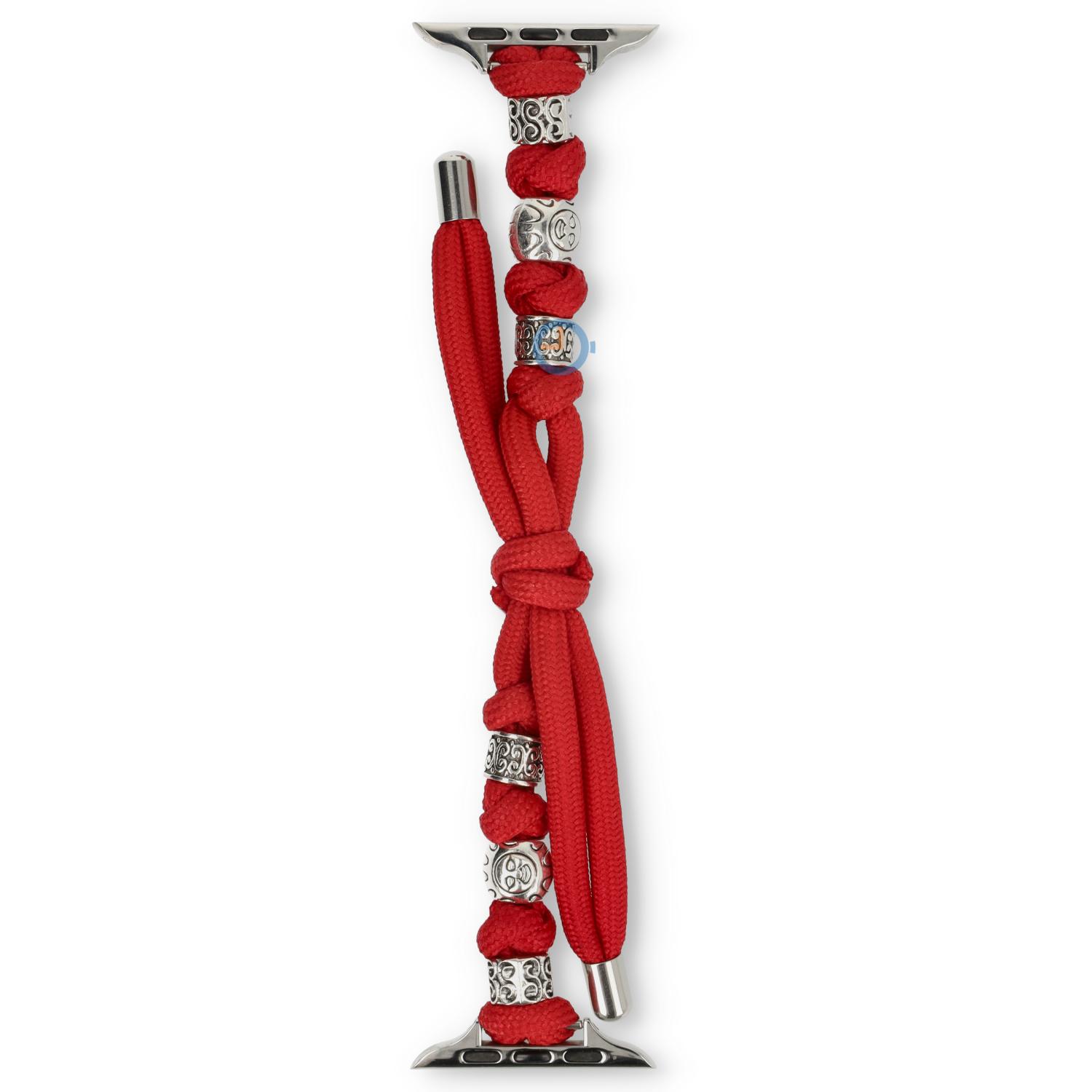 Dit is een speciaal ontworpen horlogeband voor Apple Watch 41mm, gemaakt van stevig veterkoord met geknoopte details. De stalen bedels zijn voorzien van fijne gravures, wat de band een artistieke, bohemian uitstraling geeft. Elke bedel zit stevig tussen de knopen, waardoor de band niet alleen mooi oogt maar ook goed blijft zitten.