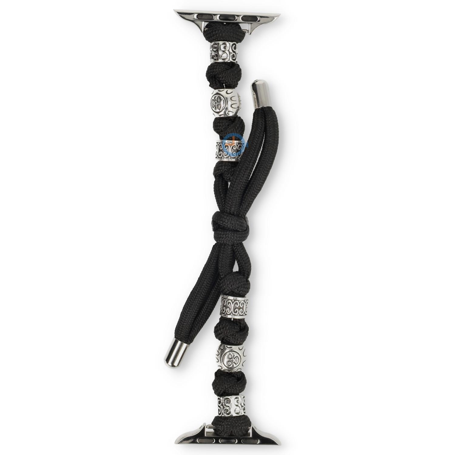 Dit is een speciaal ontworpen horlogeband voor Apple Watch 41mm, gemaakt van stevig veterkoord met geknoopte details. De stalen bedels zijn voorzien van fijne gravures, wat de band een artistieke, bohemian uitstraling geeft. Elke bedel zit stevig tussen de knopen, waardoor de band niet alleen mooi oogt maar ook goed blijft zitten.