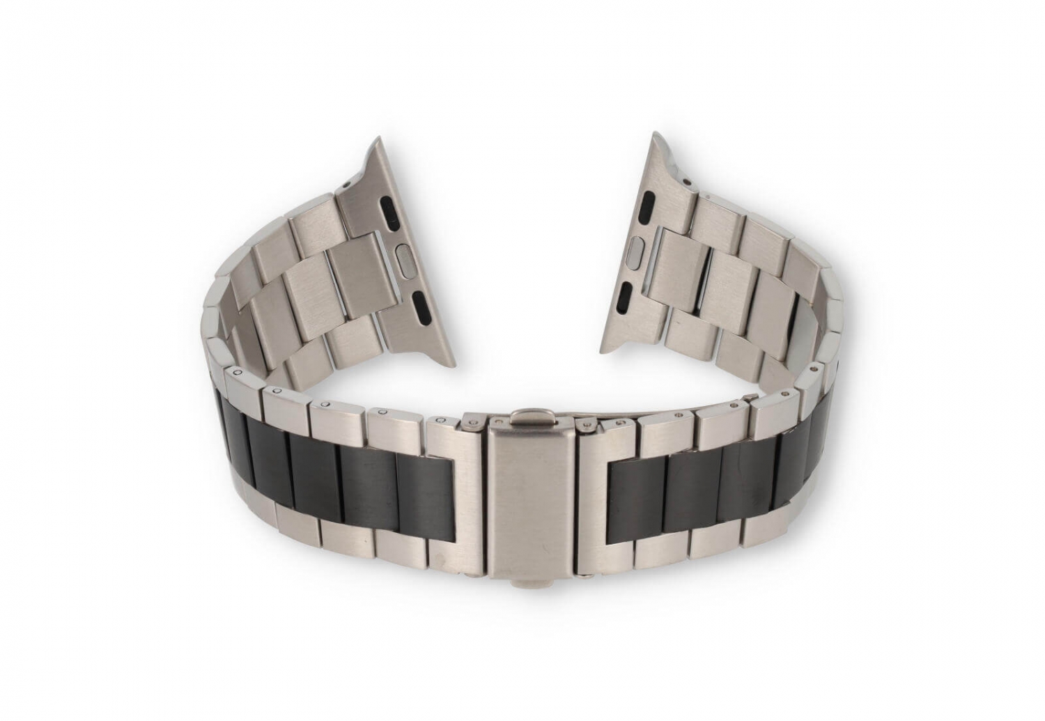 Stalen Apple Watch horlogeband 38/40/41/42mm - Zilver/zwart. Dit stijlvolle horlogebandje is gemaakt van hoge kwaliteit roestvrij staal met een sterke vouwsluiting. Door de platte schakel is het horlogebandje een stuk lichter en voel je hem nauwelijks tijdens het dragen.