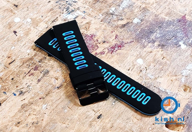 Zwart/blauw Coros bandje voor model Pace PRO. Het soepele siliconen is eenvoudig afneembaar met water. Wat het horlogebandje ideaal maakt voor elke sportieve activiteit.