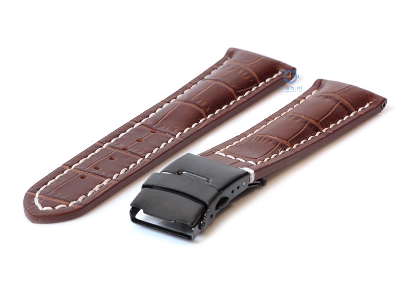 Stevige leren horlogeband van het merk Gisoni. Deze 24mm bruine horlogeband met crocoprint heeft een luxe wit stiksel dat met de hand is gezet. De horlogeband is gemaakt van echt kwaliteitleder en dat zie je zeker terug. Het horlogebandje wordt gesloten met een stevige zwarte vouwsluiting.