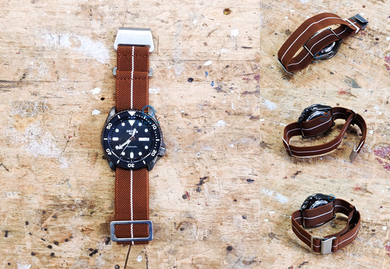 Elastische horlogeband 21mm nylon bruin - wit. Deze horlogeband is gemaakt van goede kwaliteit nylon en sluit met een handige haaksluiting. Door het elastische materiaal sluit hij goed aan om de pols en is daardoor ideaal voor alle outdoor-activiteiten. De maat van het horlogebandje is verstelbaar door de ijzeren spanner. Super handig en je hoeft nooit meer extra gaatjes er bij te laten zetten.