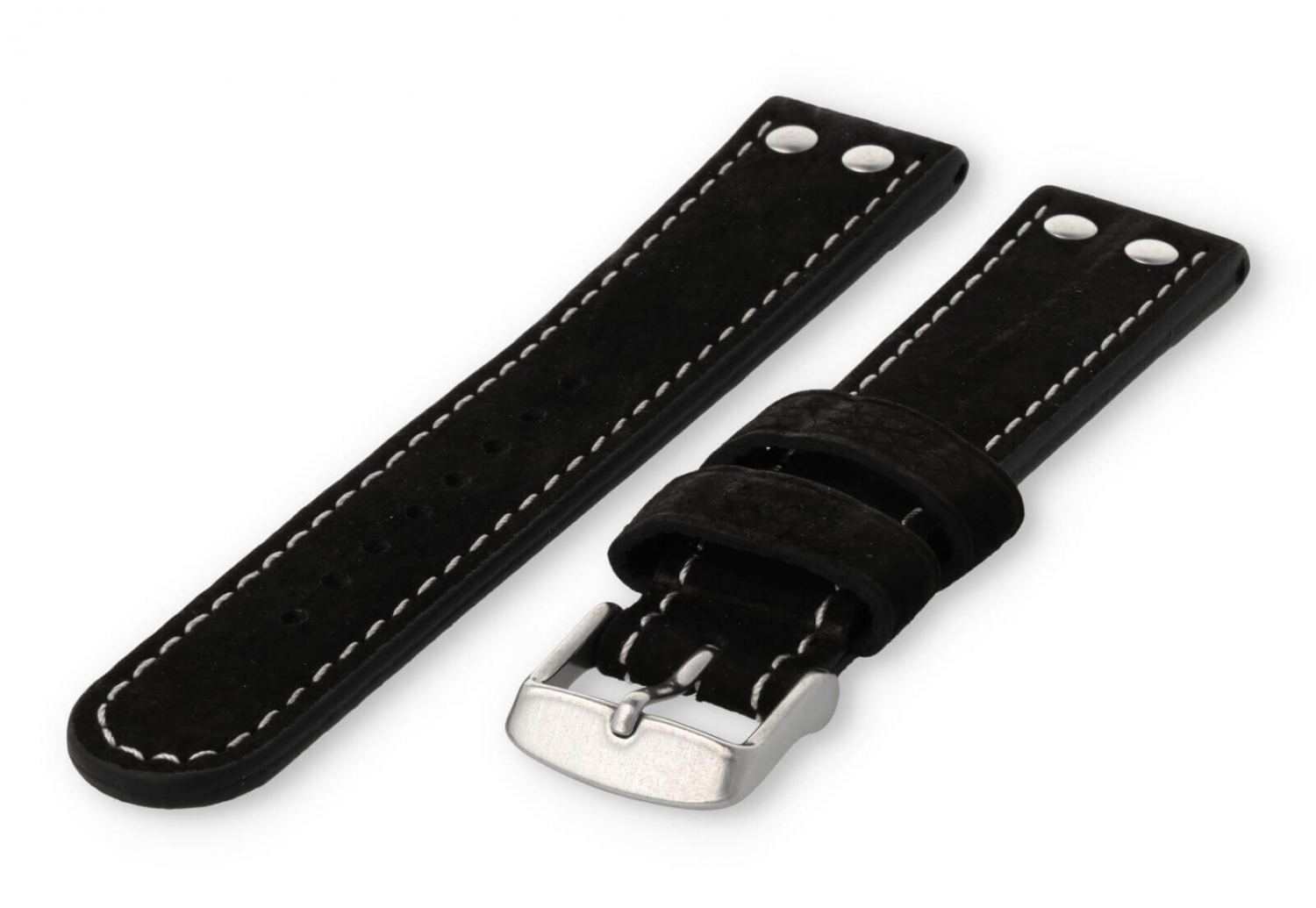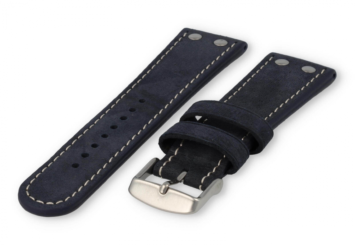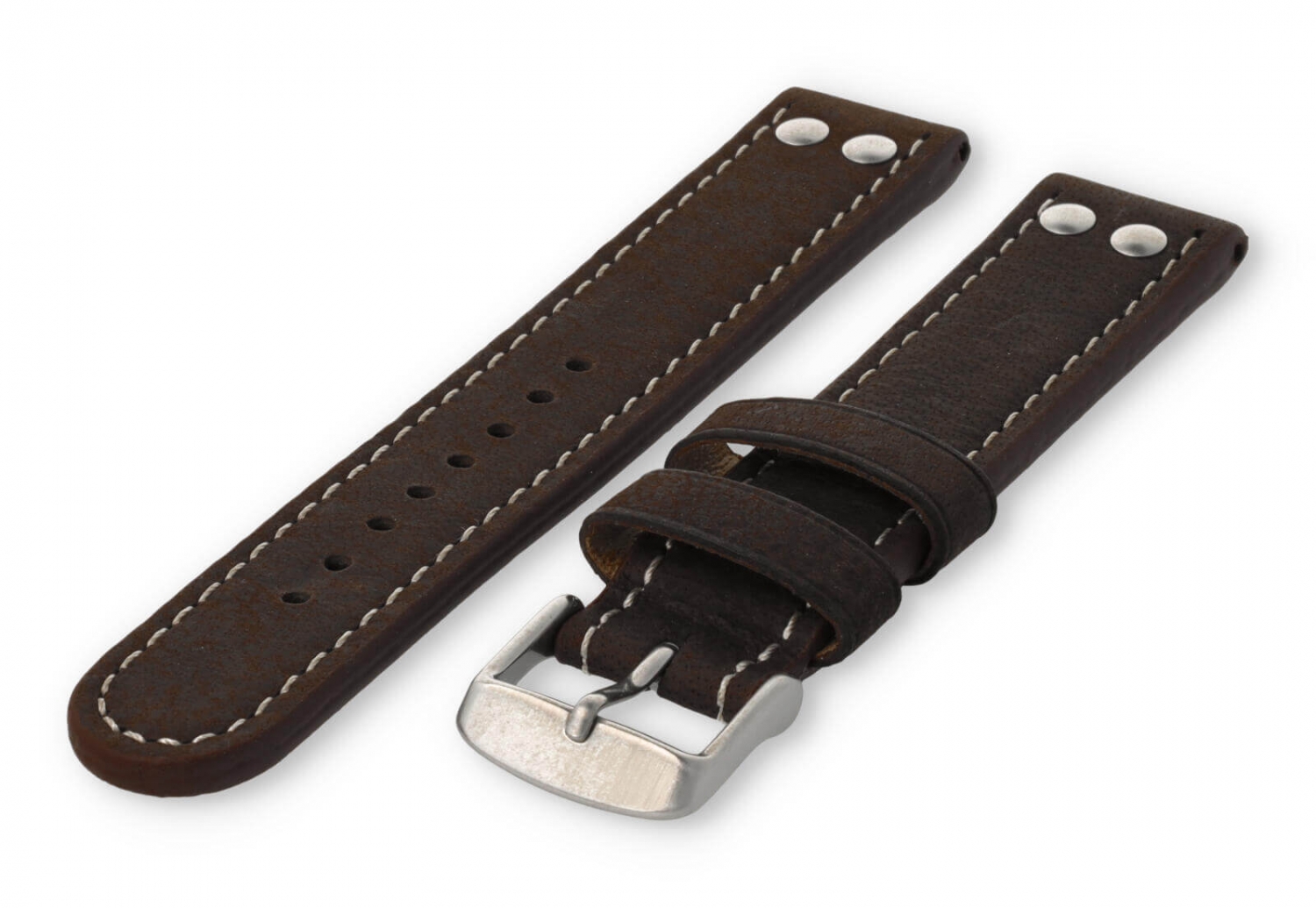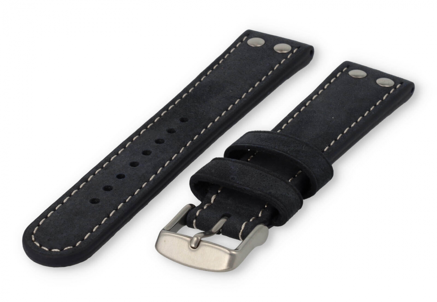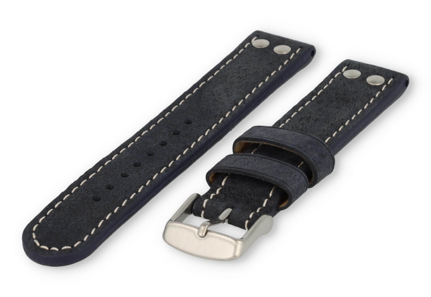 Dit extra dikke horlogebandje is gemaakt van 2 soorten leer. De bovenzijde is van waterbuffelleer en de onderkant van kalfsleer nubuk. De bovenkant heeft een matte afwerking met een grof stiksel en de sluiting is van geborsteld roestvrij staal. Je zult merken dat het bandje steeds mooier wordt naarmate het dragen.