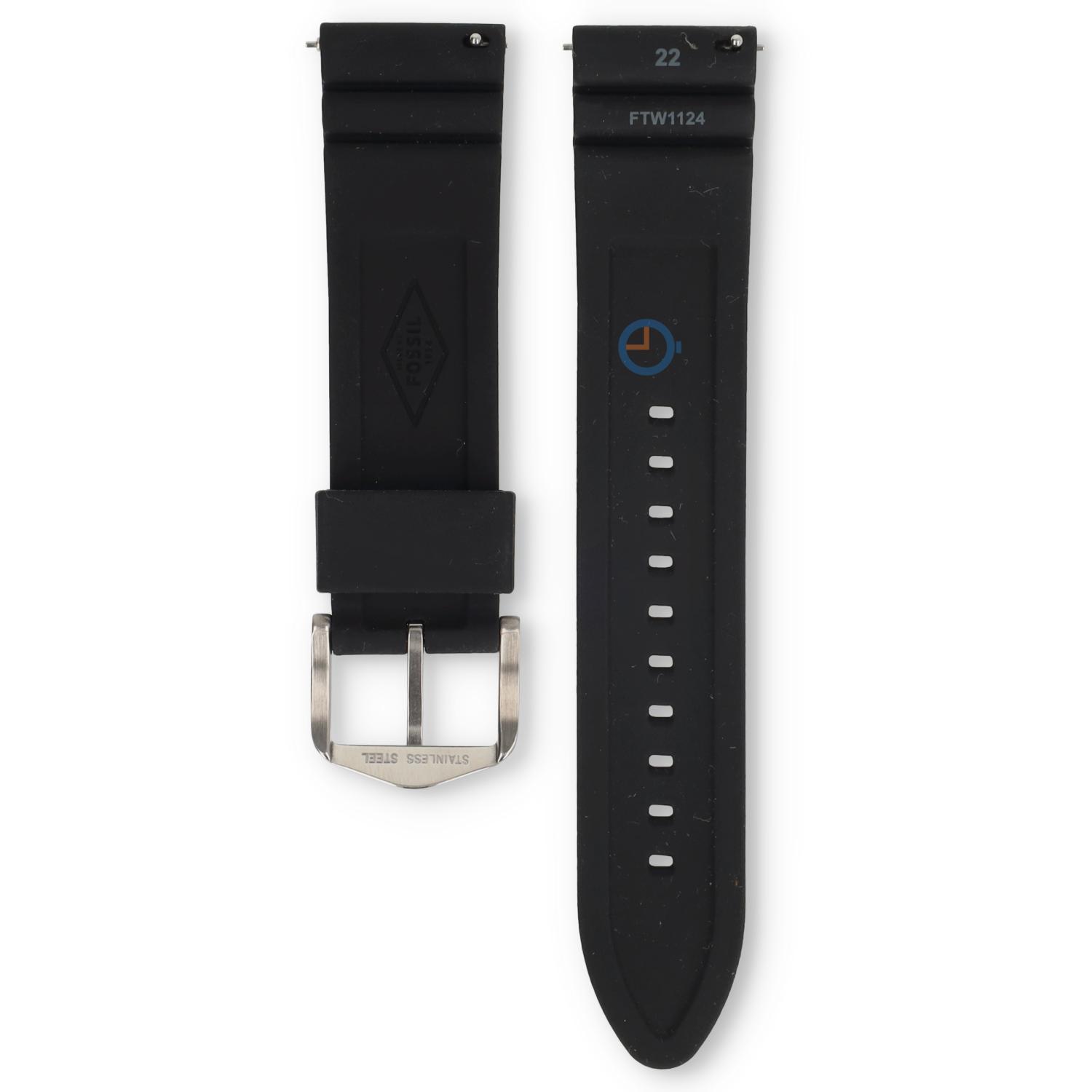 Fossil Q Hybrid FTW1124 horlogeband. Deze horlogeband is gemaakt van siliconen wat resulteert in een fijn draagcomfort. Deze zwarte 22mm siliconen horlogeband wordt geleverd inclusief gesp en quick release systeem. Bestel de springbar removal tool mee, om de horlogeband nog makkelijker te vervangen.