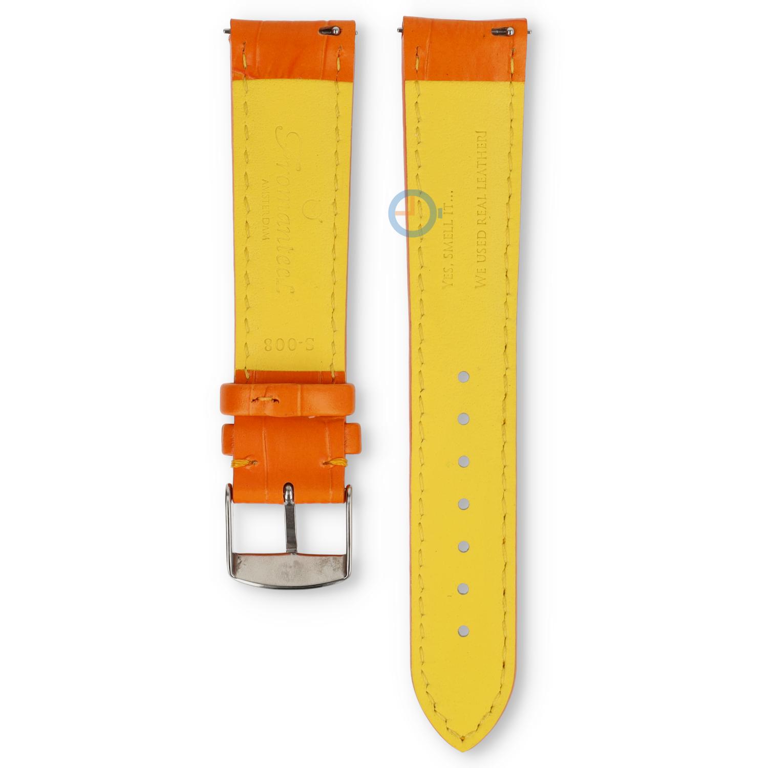 Fromanteel horlogeband oranje. Deze oranje lederen horlogeband is afgewerkt met zwart stiksel. De band is 20mm breed en heeft een gespsluiting in de gesp staat het Fromanteel logo gestanst.