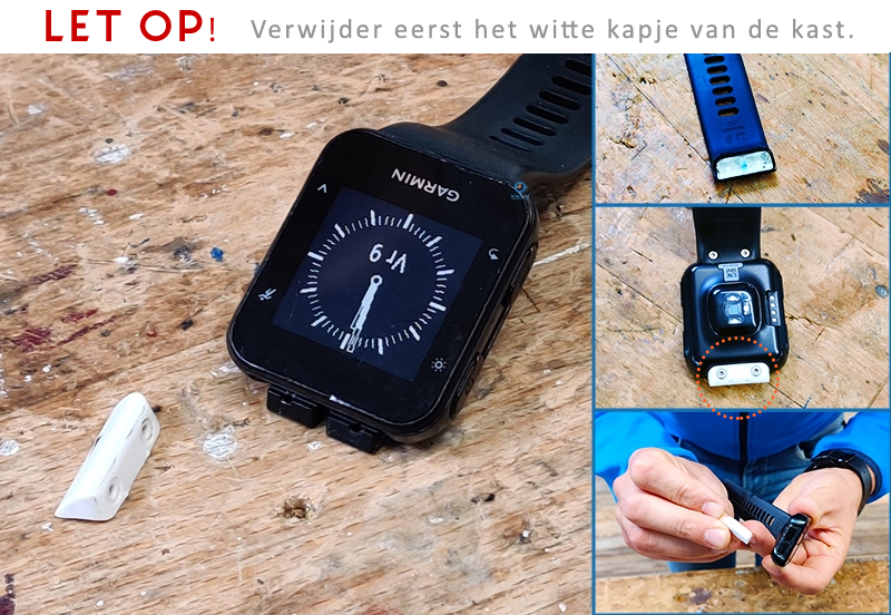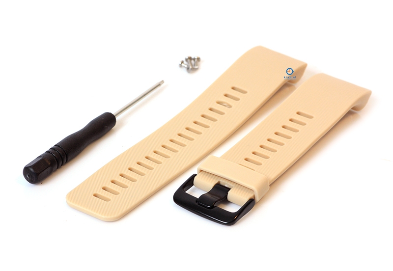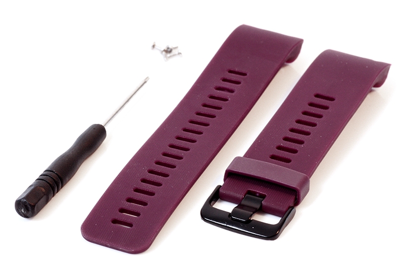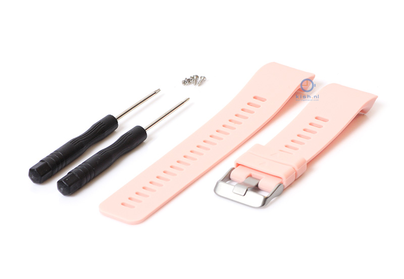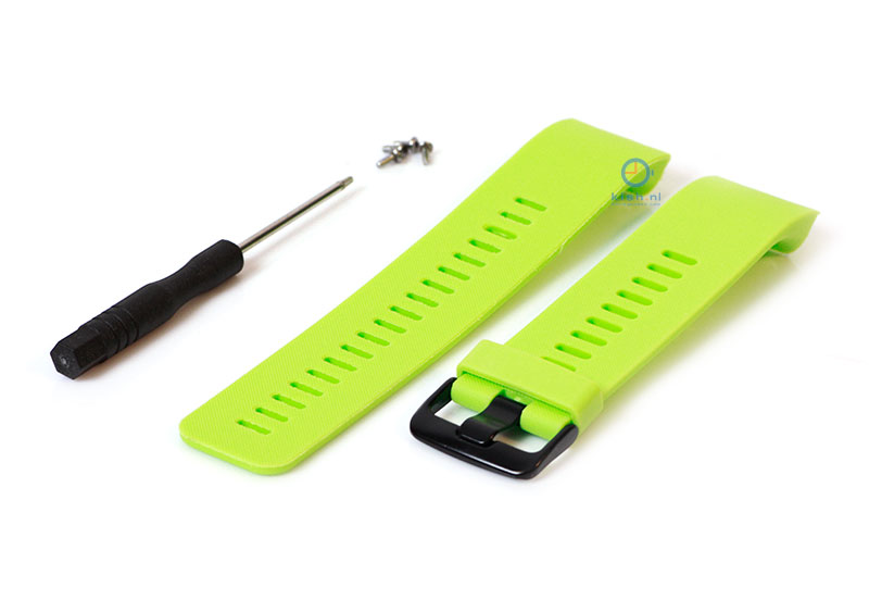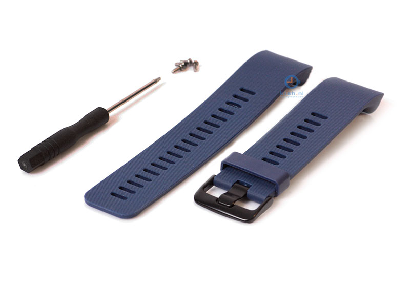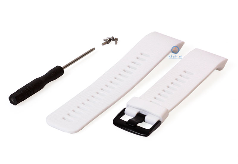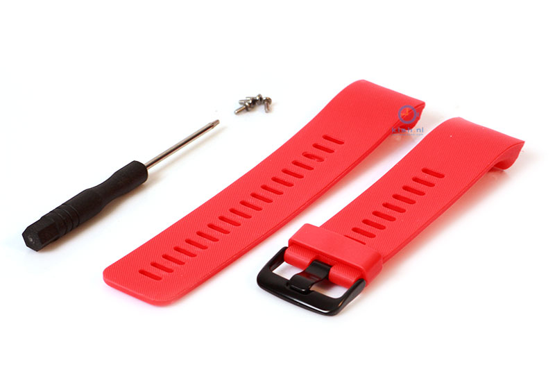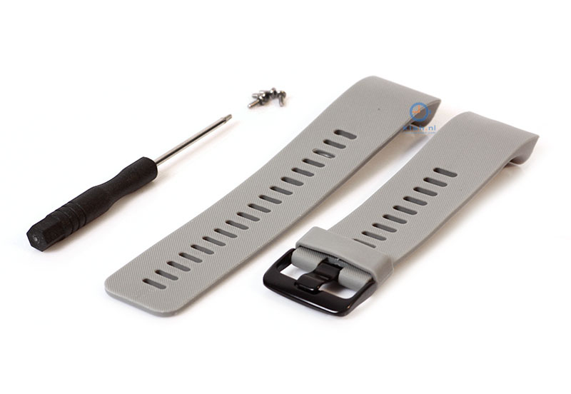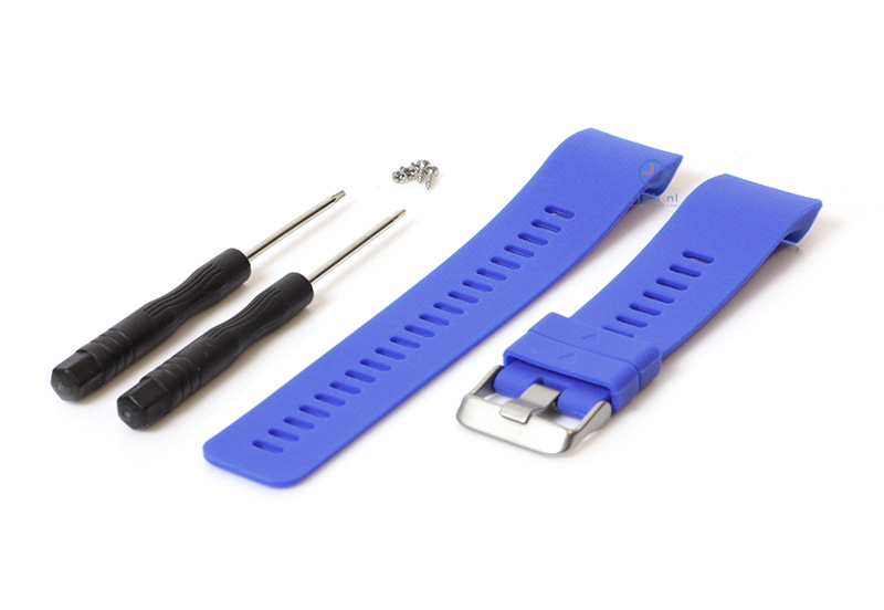 Horlogeband voor de Garmin Forerunner 35. Het horlogebandje plaats je eenvoudig aan je horloge doordat het bevestigd is met schroeven. Meestal kunnen de schroeven nog wel een ronde mee, maar kijk goed of ze niet versleten zijn. Als de schroef versleten is, is de kans groot dat jij jouw horloge verliest.