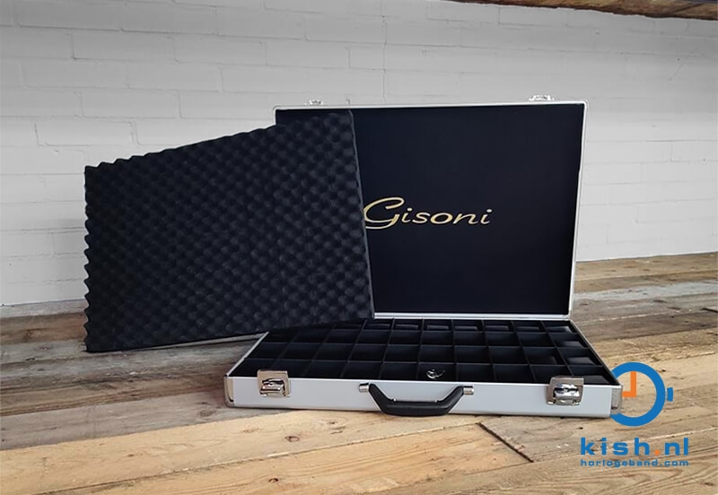 Deze Gisoni Gardo horlogekoffer heeft ruimte voor 40 grote horloges. De koffer heeft een robuust uiterlijk dankzij het aluminium. De binnenzijde is bekleed met velours en de bovenzijde aan de binnenkant van deze koffer is afgewerkt met een zacht schuim, zo kunnen uw horloges niet beschadigen. De opbergvakken in deze koffer hebben een breedte van maar liefst 53mm, de kussens zijn 47mm. Bij deze horlogekoffer worden 2 sleutels geleverd, hiermee sluit u de horlogekoffer veilig af. Bekijk al onze horlogekoffers in onze shop.
