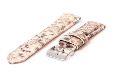 Gisoni horlogeband beige slangenleer 24mm. Gemaakt uit hoge kwaliteit slangenleer met een wit stiksel. Deze horlogeband is afkomstig van gecertificeerd slangenleer en de zachte voering zorgt voor een hoog draagcomfort. De huiden zijn afkomstig van speciale kwekerijen en worden niet aan wild onttrokken. Bij een horlogeband van echt slangenleer is geen enkele horlogeband het zelfde, waardoor de banden een luxe uitstraling geven aan uw horloge. Met een springbar removal tool bevestigt u deze horlogeband eenvoudig, binnen enkele ogenblikken, zelf aan uw horloge.