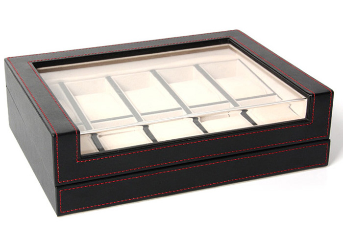 Gisoni Pruno leder horlogekist voor 10 (grote) horloges. Schitterende zwart lederen horlogekist voor 10 horloges. De box heeft een kunststof venster en is afgewerkt met wit stiksel. Deze horlogebox past in elk interieur, zowel trendy als klassiek.