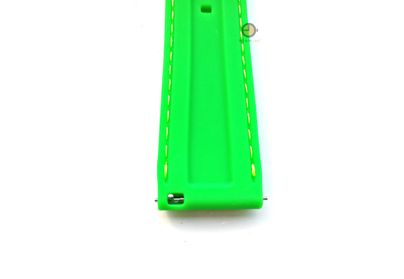 Comfortabele horlogeband 18mm siliconen in groene kleur. Deze horlogeband is gemaakt van siliconen en is erg flexibel, wat resulteert in een fijn draagcomfort. Deze 18mm siliconen horlogeband wordt geleverd inclusief gesp en ingebouwde springbars (ook wel quick release systeem/QRS genoemd). Bestel de springbar removal tool mee, om de horlogeband nog makkelijker te ververvangen.