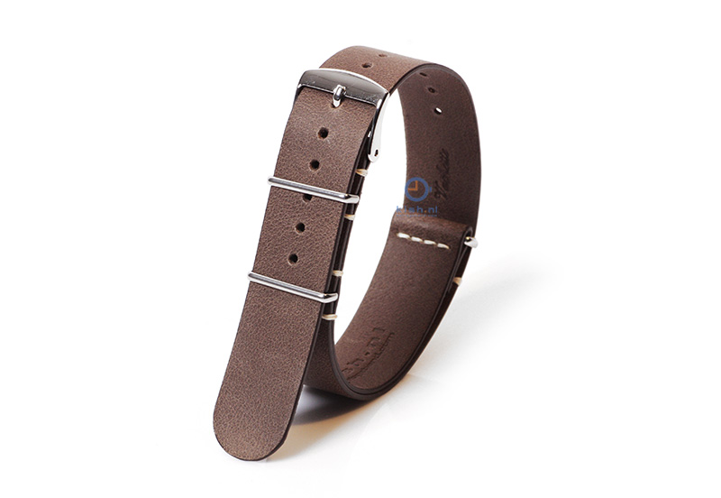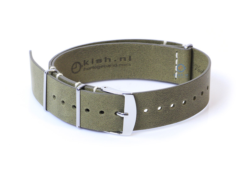 Kish Premium horlogeband 18mm nato kalfsleer kaki groen. Universeel horlogebandje gemaakt van uitstekende kwaliteit kalfsleer. Het leer voelt soepel aan, wat resulteert in een fijn draagcomfort. De band heeft een vintage look en word gesloten met een stevige gespsluiting.