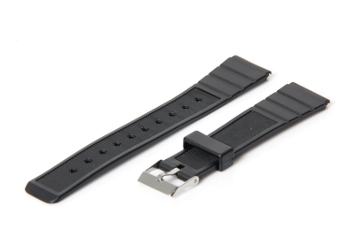 Horlogeband 18mm rubber zwart. Deze horlogeband heeft een gespsluiting. De stoere horlogeband is eenvoudig zelf te monteren aan uw horloge en is uitermate geschikt voor sport en duikhorloges.