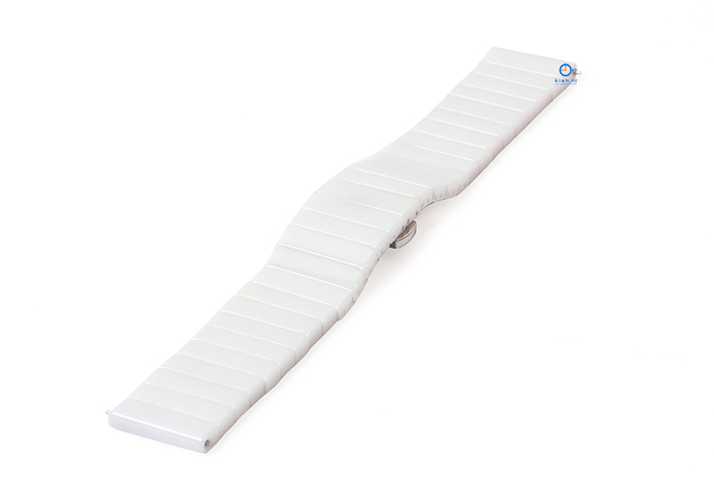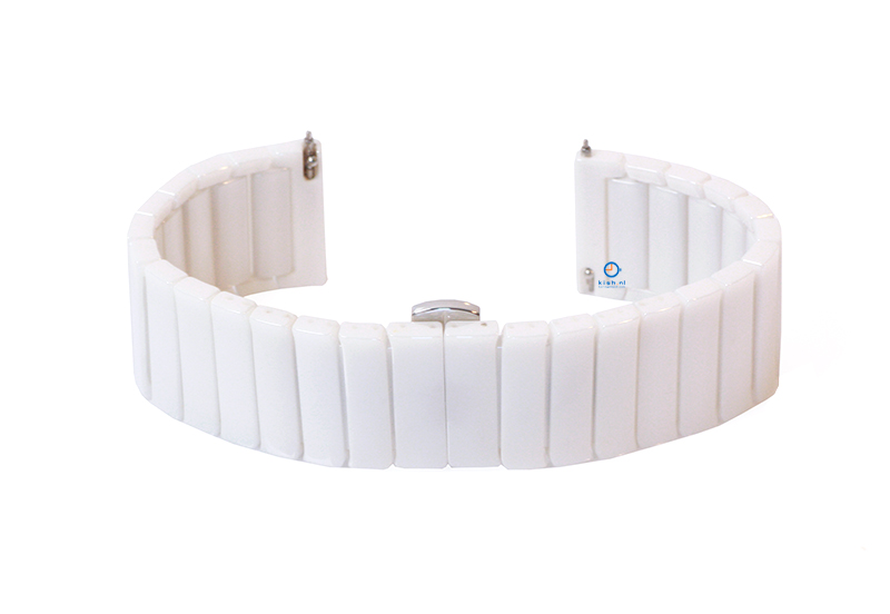 Universele horlogeband 20mm keramiek. Deze keramische horlogeband geeft jouw horloge niet alleen een chique uitstraling, maar ook heeft het keramische materiaal een zeer hoge krasbestendigheid. Daar bovenop komt nog dat het keramiek anti-allergische eigenschappen heeft en niet word aangetast door het zonlicht. Je kan het horlogebandje inkorten met 6 schakels, zo is hij ook passend voor een smallere pols!