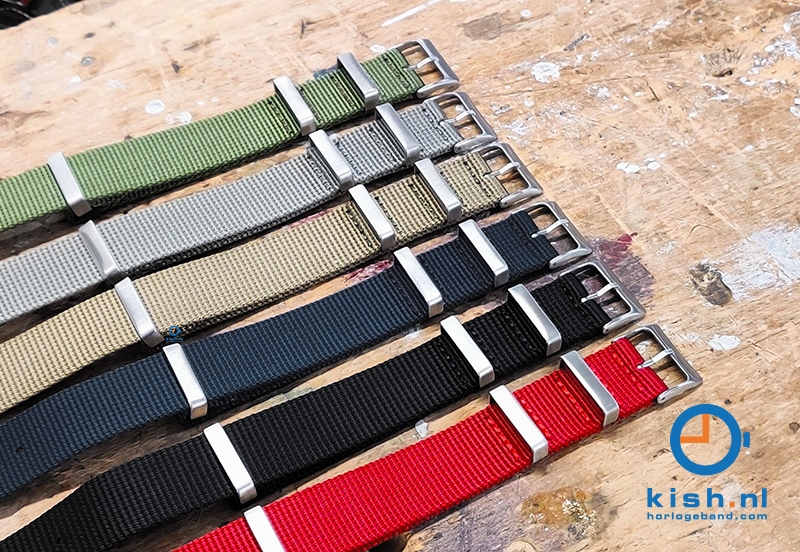 Deze universele nato horlogeband is gemaakt van ijzersterk geweven nylon. Het nylon horlogebandje voorkomt dat de horlogekast de huid raakt en zorgt voor stabiliteit tijdens het dragen. Deze horlogeband is uit ?n stuk en heeft een slide-in bevestiging. Schuif het horlogebandje door de spring bars, die aan de horlogekast zijn bevestigd. Haal hem vervolgens weer door het overgebleven flapje. Dit voorkomt dat het horloge van het horlogebandje af kan glijden.