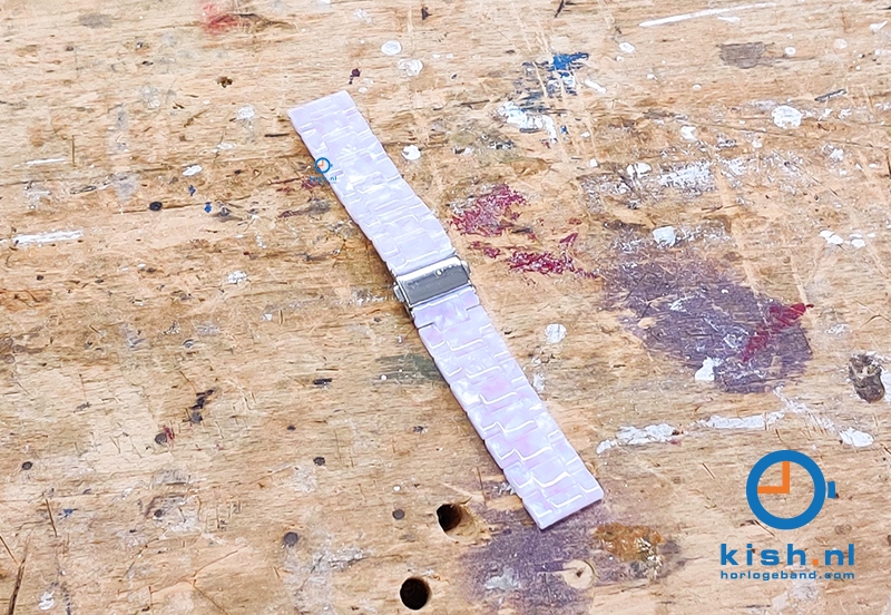 Draag jouw horloge of smartwatch in stijl met deze geweldige horlogeband met Parelmoer effect. Jouw outfit maak je compleet met deze premium kunststof Parelmoer band met zilveren (druk)vouwsluiting waarvan de schakels verwijderbaar zijn, zodat het bandje precies op maat gemaakt kan worden.