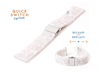 Draag jouw horloge of smartwatch in stijl met deze geweldige horlogeband met Parelmoer effect. Jouw outfit maak je compleet met deze premium kunststof Parelmoer band met zilveren (druk)vouwsluiting waarvan de schakels verwijderbaar zijn, zodat het bandje precies op maat gemaakt kan worden.