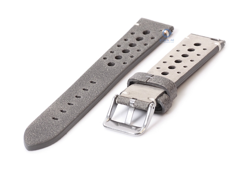 Premium horlogeband 20mm vintage perforated grijs leer. Deze universele horlogeband is gemaakt van kalfsleer en tot in detail afgewerkt. Het horlogebandje heeft een buitengewoon uitstekende kwaliteit en word gesloten met een stevige gespsluiting. De geperforeerde gaten geven deze horlogeband een sportieve look. Door de extra versteviging aan de bevestigingszijde, wordt uitscheuren aanzienlijk verkleind.