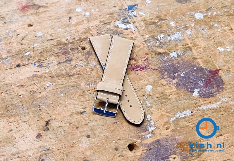 Horlogeband 22mm beige. Universeel horlogebandje gemaakt van echt kalfsleer (extra dik). Deze horlogeband heeft een gladde structuur en is handmatig gestikt. Eenvoudig zelf te monteren aan uw horloge met behulp van een spring bar removal tool.