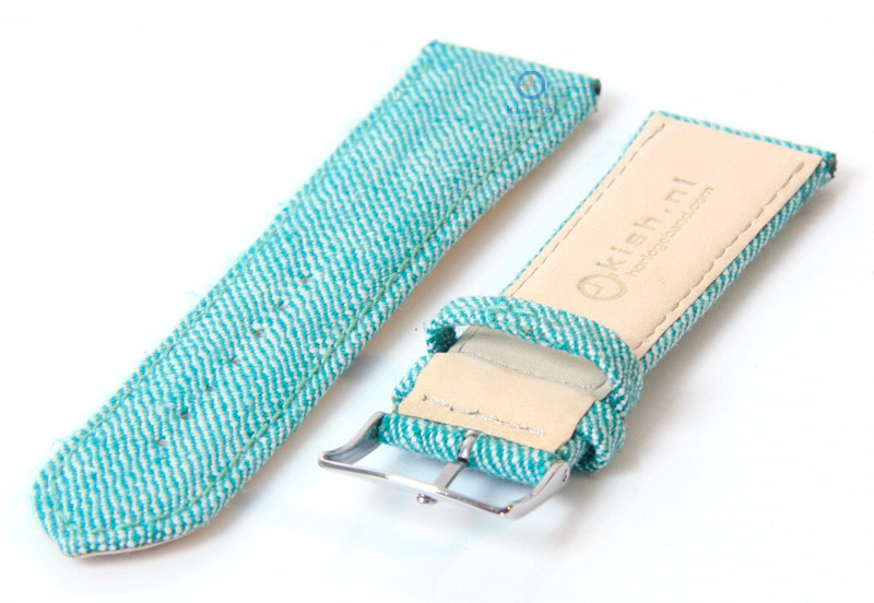 Horlogeband 22mm denim jeans groen. Deze horlogeband voelt stevig aan en is gemaakt van denim jeans stof. Dit horlogebandje is handmatig gestikt. Je bevestigt deze horlogeband met 22mm springbars. Bestel de spring bar removal tool mee om de horlogeband nog makkelijker te vervangen.