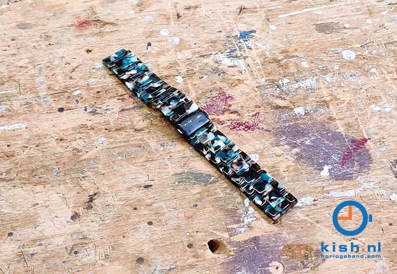 Draag jouw horloge of smartwatch in stijl met deze geweldige horlogeband met Turtle effect. Jouw outfit maak je compleet met deze premium kunststof Turtle band met zwarte (druk)vouwsluiting waarvan de schakels verwijderbaar zijn, zodat het bandje precies op maat gemaakt kan worden.