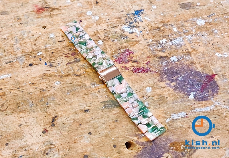 Draag jouw horloge of smartwatch in stijl met deze geweldige horlogeband met Turtle effect. Jouw outfit maak je compleet met deze premium kunststof Turtle band met rosegold (druk)vouwsluiting waarvan de schakels verwijderbaar zijn, zodat het bandje precies op maat gemaakt kan worden.
