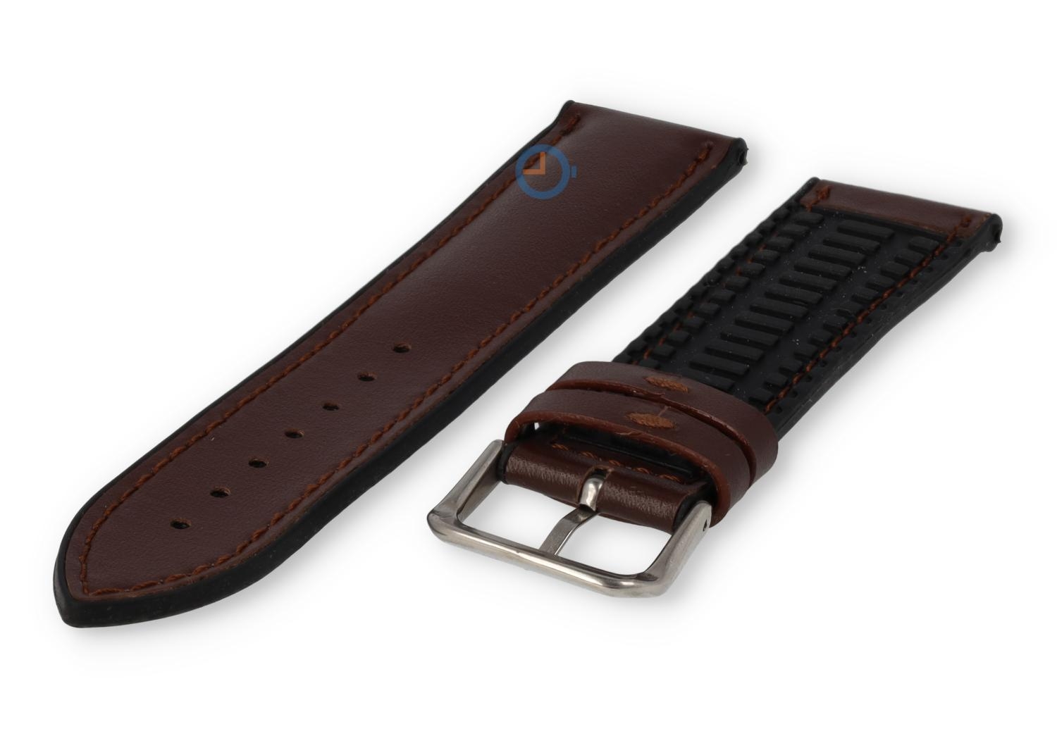 Universele Horlogeband 22mm siliconen. Met deze horlogeband heb je het comfort van een rubberen horlogeband en de uitstraling van een leren horlogeband. Het horlogebandje heeft een bruin leren toplaag en is afgewerkt met een bruin stiksel.