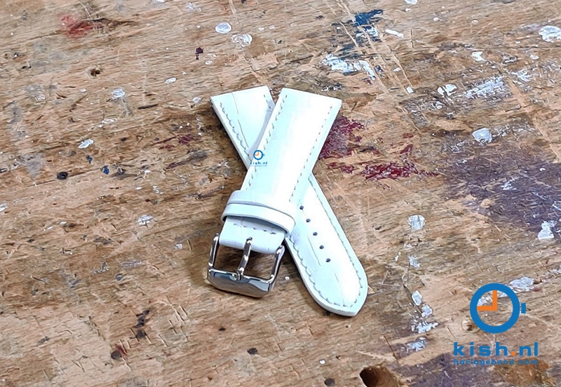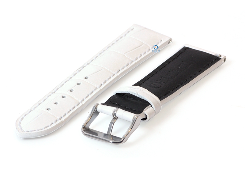 Universele horlogeband gemaakt van kalfsleer. Door de kwaliteit van het leer voelt het horlogebandje direct soepel en vormt direct goed om je pols. Toch zorgt het dikke leer voor extra stevigheid. Deze gave croco toplaag heeft een mooie frisse witte kleur, die je gemakkelijk kan combineren.