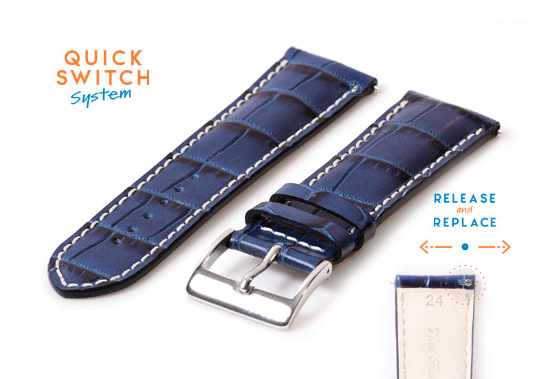 Horlogeband leer 24mm blauw. Universele horlogeband gemaakt van een hoogwaardige kwaliteit leer. Heel verfijnd afgewerkt en met de hand gestikt. Passend aan horloges met een 24mm aanzet. Je bevestigt deze horlogeband eenvoudig aan je horloge met het Quick Switch systeem.