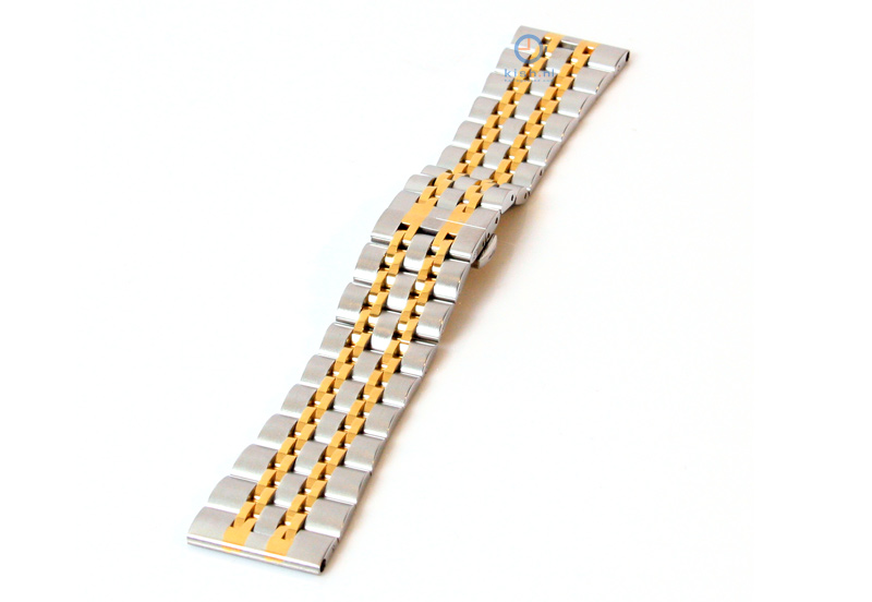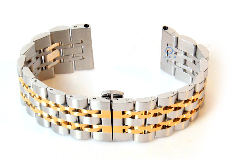 Universele horlogeband 24mm zilver goud. Deze edelstalen horlogeband heeft een comfortabele vlindersluiting en is geschikt voor horloges met een 24mm aanzet. Het horlogebandje is eenvoudig aan uw horloge te bevestigen met 24mm springbars en een Springbar removal tool. Bekijk alle stalen horlogebanden in onze shop.
