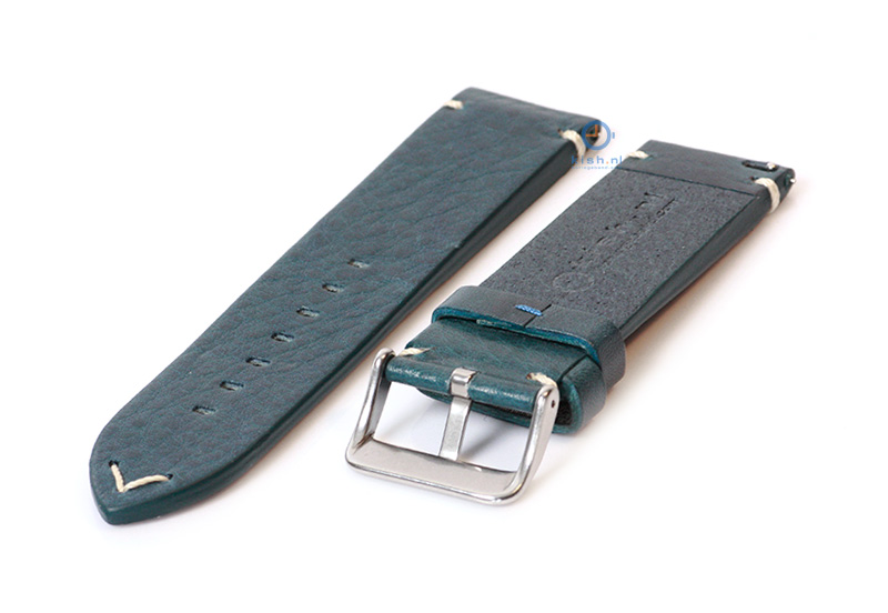 Premium horlogeband 24mm vintage blauw leer. Het horlogebandje is gemaakt van uitstekende kwaliteit kalfsleer en is afgewerkt tot in de puntjes. Deze universele horlogeband heeft beige stiksels wat het horlogebandje een gave vintage look geeft. De horlogeband is aan de bevestigingszijde extra verstevigd, zodat uitscheuren bijna onmogelijk is.