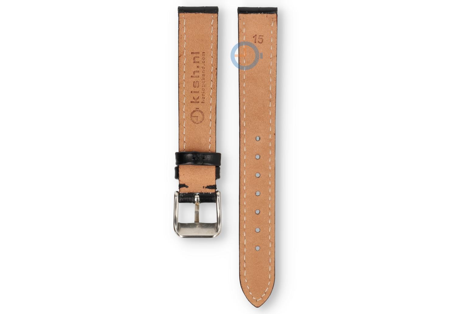 15mm bandje van croco leer - zwart. Dit horlogebandje heeft een oneven maat: 15mm. Het leer heeft een luxe crocoprint gestansd en heeft een klassiek Tone-in-Tone stiksel. De gesp is in hoogglans staal en wordt gemonteerd meegeleverd.