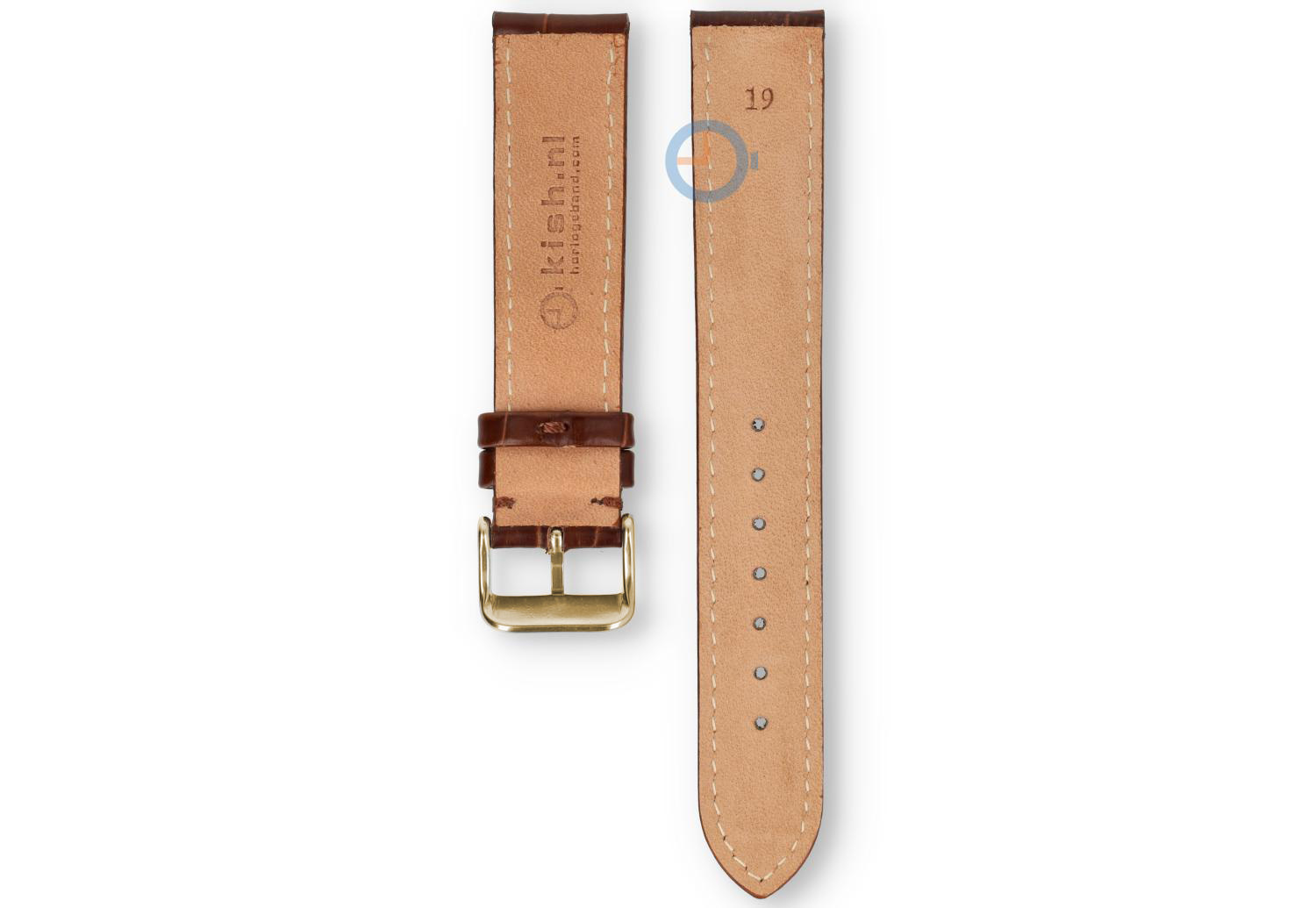 19mm bandje van croco leer - donkerbruin. Dit horlogebandje heeft een oneven maat: 19mm. Het leer heeft een luxe crocoprint gestansd en heeft een klassiek Tone-in-Tone stiksel. De goudkleurige gesp is in hoogglans staal en wordt gemonteerd meegeleverd.