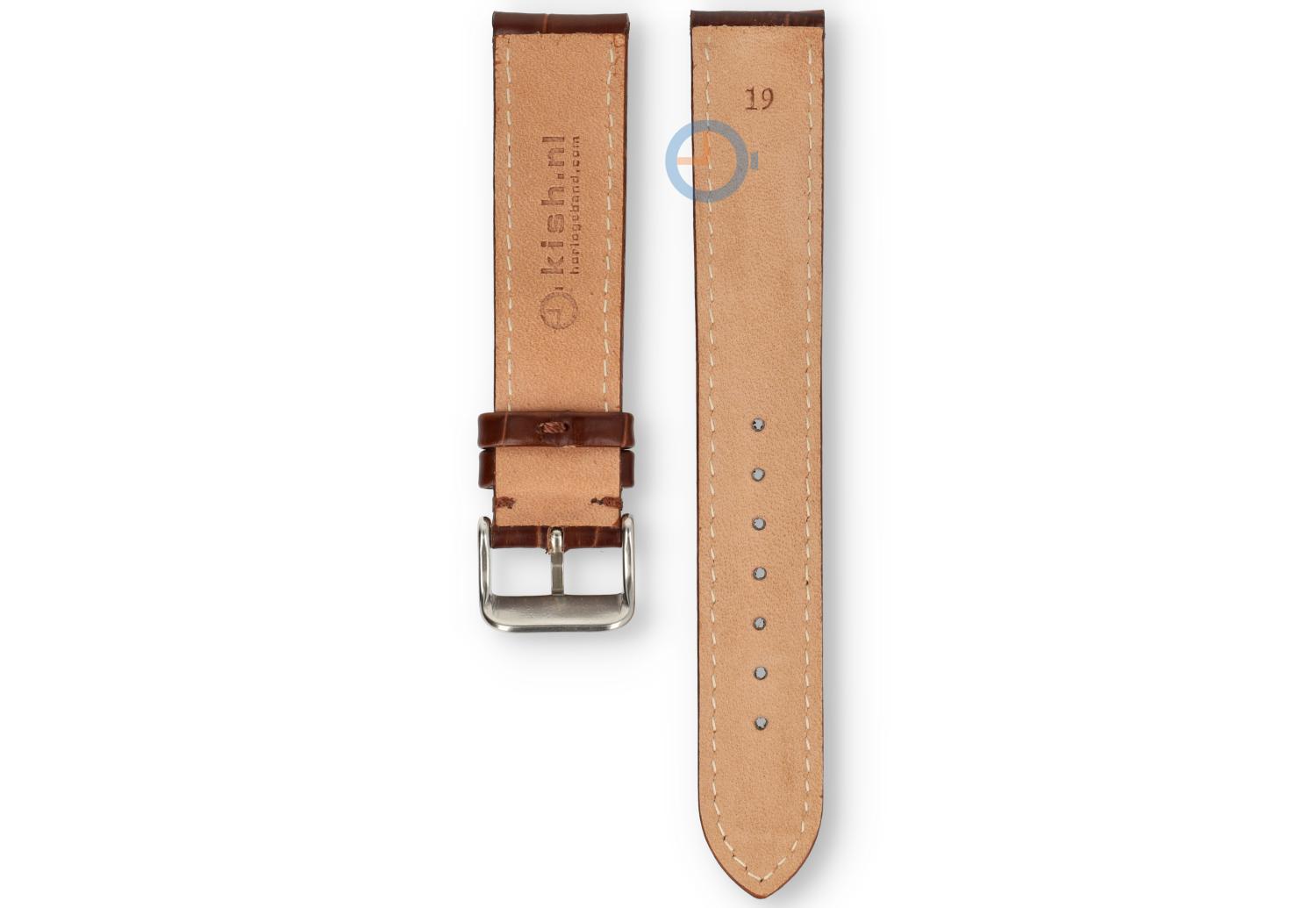 19mm bandje van croco leer - donkerbruin. Dit horlogebandje heeft een oneven maat: 19mm. Het leer heeft een luxe crocoprint gestansd en heeft een klassiek Tone-in-Tone stiksel. De gesp is in hoogglans staal en wordt gemonteerd meegeleverd.