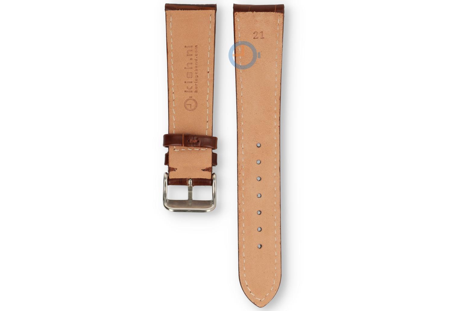21mm bandje van croco leer - donkerbruin. Dit horlogebandje heeft een oneven maat: 21mm. Het leer heeft een luxe crocoprint gestansd en heeft een klassiek Tone-in-Tone stiksel. De gesp is in hoogglans staal en wordt gemonteerd meegeleverd.
