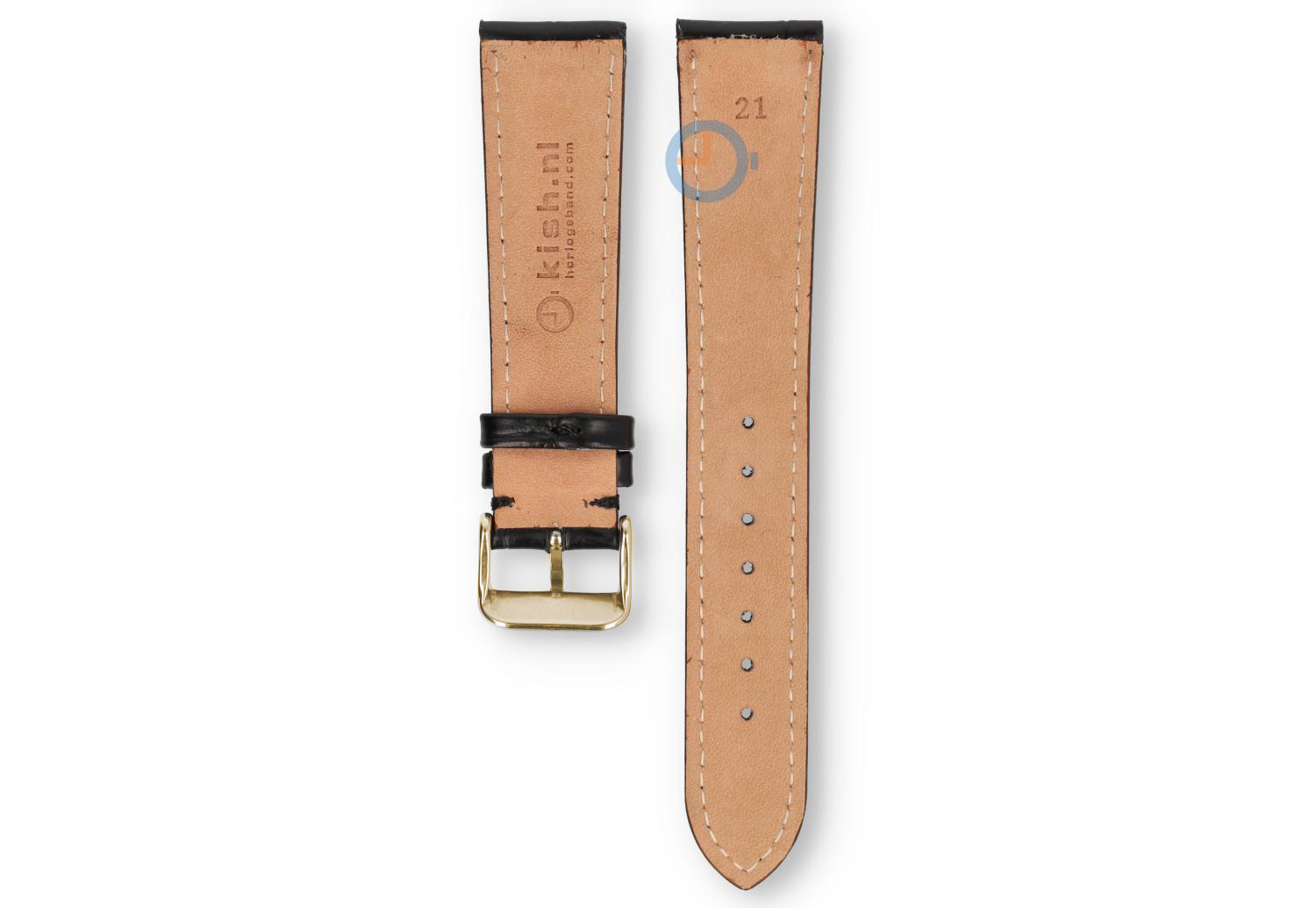 21mm bandje van croco leer - zwart. Dit horlogebandje heeft een oneven maat: 21mm. Het leer heeft een luxe crocoprint gestansd en heeft een klassiek Tone-in-Tone stiksel. De goudkleurige gesp is in hoogglans staal en wordt gemonteerd meegeleverd.