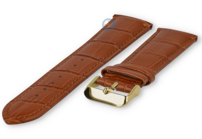 23mm bandje van croco leer - cognacbruin. Dit horlogebandje heeft een oneven maat: 23mm. Het leer heeft een luxe crocoprint gestansd en heeft een klassiek Tone-in-Tone stiksel. De goudkleurige gesp is in hoogglans staal en wordt gemonteerd meegeleverd.