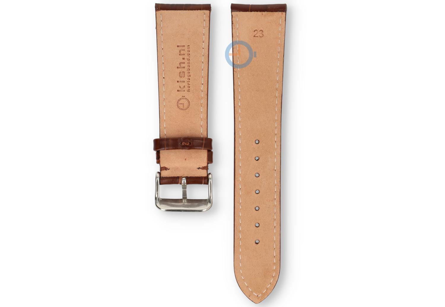 23mm bandje van croco leer - donkerbruin. Dit horlogebandje heeft een oneven maat: 23mm. Het leer heeft een luxe crocoprint gestansd en heeft een klassiek Tone-in-Tone stiksel. De gesp is in hoogglans staal en wordt gemonteerd meegeleverd.
