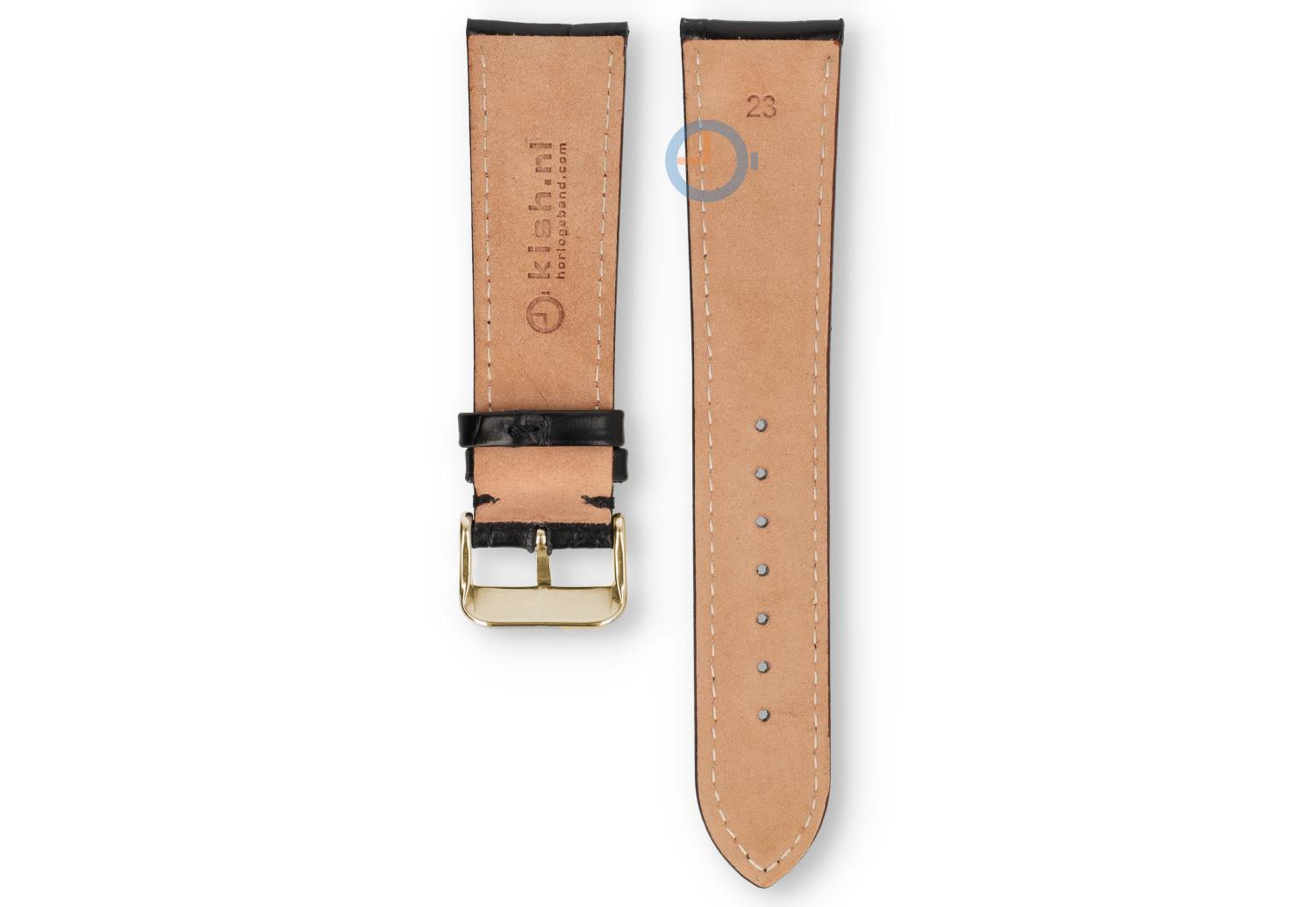 23mm bandje van croco leer - zwart. Dit horlogebandje heeft een oneven maat: 23mm. Het leer heeft een luxe crocoprint gestansd en heeft een klassiek Tone-in-Tone stiksel. De goudkleurige gesp is in hoogglans staal en wordt gemonteerd meegeleverd.