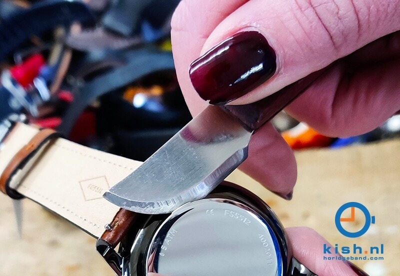 Door het mesje achter het lipje van de horlogedeksel te zetten, kun je doormiddel van een heffende beweging de deksel los wippen. Pas op dat je bij deze heffende beweging het mesje niet achter het lipje weg laat schieten. Hierdoor kan je de achterplaat van het horloge beschadigen.