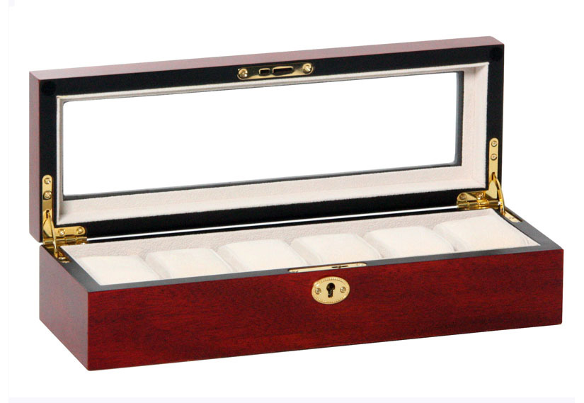 Luxe houten horlogekist voor het opbergen van 6 horloges. De horlogekist heeft een mooie bordeaux kleur en is tot in de puntjes afgewerkt. Het venster in het deksel van de kist is gemaakt van kunststof en geeft zicht op alle horloges. Ieder horloge heeft een eigen opbergvak met daarin een kussentje waarop u het horloge kunt plaatsen. Deze kussentjes zijn ca. 45mm breed en klemmen zich in het vakje, zodat het horloge geen ruimte heeft om te bewegen en te beschadigen. De binnenzijde is voorzien van een zachte laag ivoorkleurig velours. De horlogekist wordt geleverd met sleutels, zodat u de kist veilig kunt afsluiten.